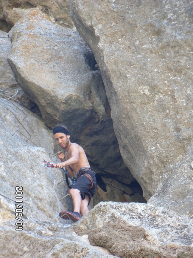 Por ahora soy pluriempleado, durante la semana tengo una gran carga de trabajo y los fines de semana trabajando como extra en la cocina de banquetes de bodas, no tengo tiempo de hacer rutas de senderismo, así que el Domingo me fui un rato a Comares, a pocos kilómetros de donde yo vivo, Vélez-Málaga, a realizar mi primera experiencia vertical en una ferrata y rappel. Cuando me encontraba en faena, pensé "¡¿cómo es posible que me haya estado perdiendo de esto toda mi vida?!". Fue amor a primera vista y en ese momento decidí que las ascensiones verticales en el futuro formaría parte de mi vida.