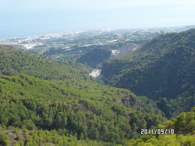 | Vistas de Nerja desde donde termina la acequia, comienza la verea hasta el río, al fondo se ve la explanada donde se aparcan los coches, a la derecha se ve Frigiliana. |