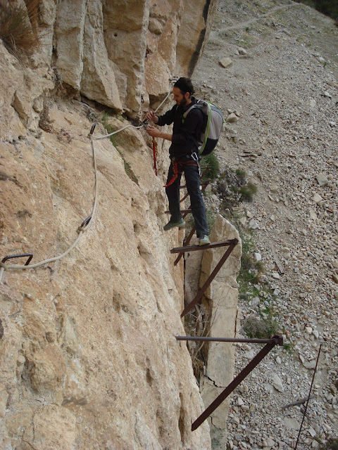 Como la entrada al caminito está derrumbada se puede acceder desde estas vigas de hierro ayudado de unas grapas de hierro en la roca, como seguridad una cuerda puesta por alguien.