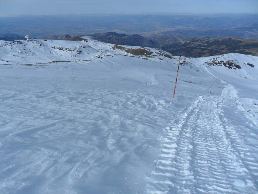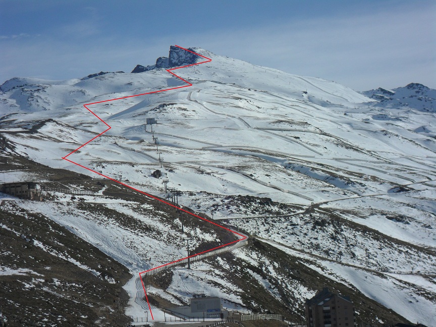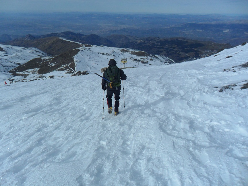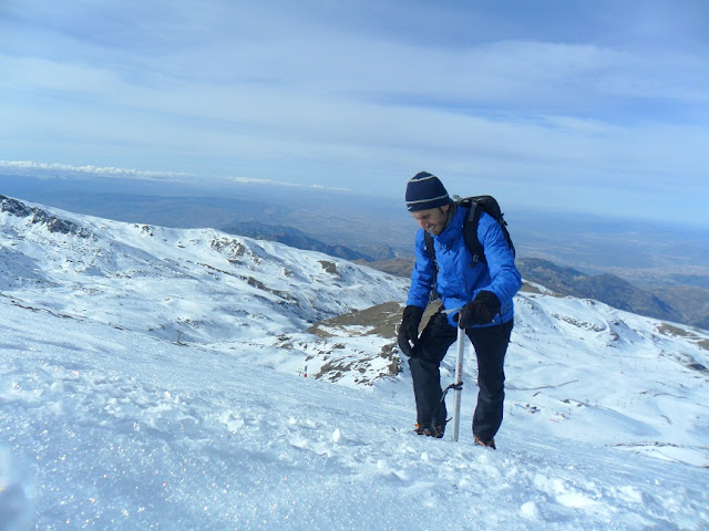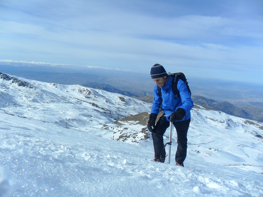 altitud de 3.395,68 msnm, la cuarta cumbre más alta de España y segunda de su cordillera por detrás del Mulhacén 3.482 msnm. El Albergue Juvenil está situado a unos 2400 metros del nivel del mar, justo el último lugar donde se puede dejar el vehículo, empecé a caminar sobre las 10 de la mañana (sí, muy tarde pero no es fácil dejar a mi perro sólo) y llegué a mi coche sobre las 3 de la tarde, unas 5 horas sin paradas, unos 14 kilómetros, ida y vuelta. El único problema a destacar ha sido que al colocarme los crampones, me quité los guantes, aproveché para realizar fotos, hubo un momento en que no podía volver a sacarlos de la mochila para ponérmelos, tenía la suficiente sensibilidad para maniobrar con las manos. Doy gracias a la vida por esta maravillosa oportunidad y ojalá sea el comienzo de una larga relación con la nieve.