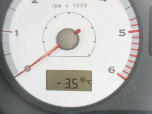 | Llegué sobre las 9:30 y el termómetro del coche marcaba -3,5º pero en zonas donde no daba el sol hacia hasta -5º. |