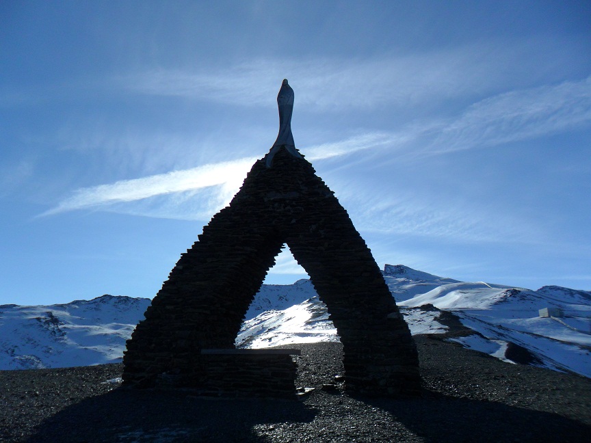 | Monumento a la Virgen de las Nieves, patrona de Sierra Nevada, en la parte de arriba escultura en aluminio |