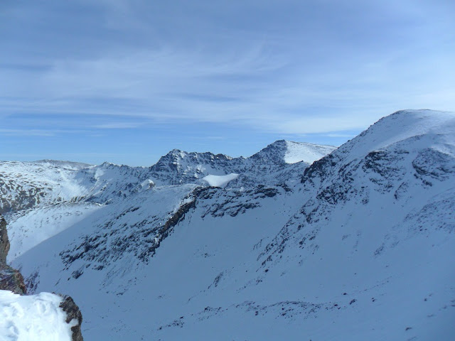 | Impresionantes los vertiginosos tajos que perfilan las caras del Veleta aunque no salen en la foto, queda a la derecha. Pero si sale el Mulhacén y Alcazaba. |