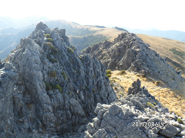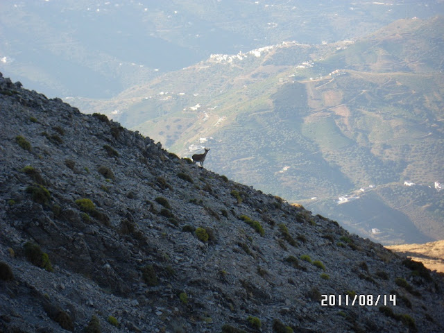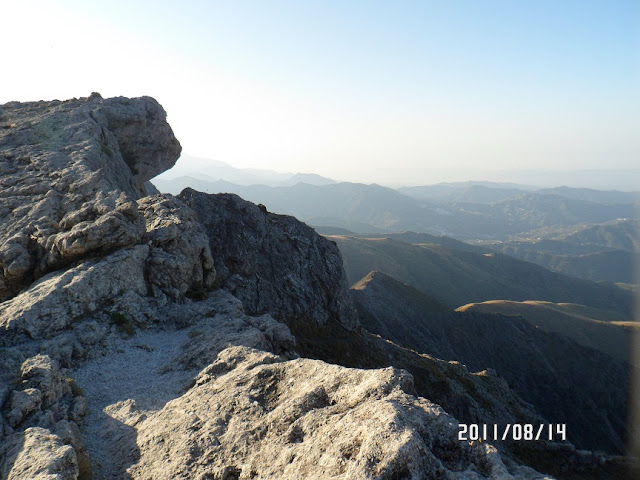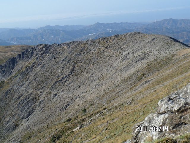 Recorrido: Salimos desde El Alcazar por una pista que se dirige hacia el Norte en clara subida. A partir de ahí no abandonaremos la pista hasta pasados 5 kms, descartando otras pistas y caminos que salen de la principal. Justo en el km 5 la pista se acaba, hemos llegado a la Loma de las víboras y comienza en ese mismo punto una senda, a la derecha, que va ganando altura a media ladera realizando algunas zetas. Es uno de los tramos más bonitos de la ruta. Poco a poco el terreno se va haciendo más pedregoso y los últimos 2 kms de la subida son verdaderamente duros, sobretodo con las mochilas en las espaldas. Tampoco hay perdida ya que en los puntos donde puede haber conflicto hay indicaciones claras, todo el recorrido eres acompañado por estacas de señalización.. Tan sólo los últimos 500 metros son algo más abiertos, sin camino evidente, pero ya se trata sólo de seguir subiendo. La llegada al vértice geodésico que separa las provincias de Málaga y Granada es muy gratificante ya que es el único sitio en toda la subida en el que tendremos vistas completas a la costa. Se continua en dirección la Llanada de Sedella, bien por la Tazita de la Plata o por el cordal fronterizo, una vez allí cogemos la pista forestal que va en dirección a puerto blanquillo y se baja hacia la fábrica de la luz de Canillas.