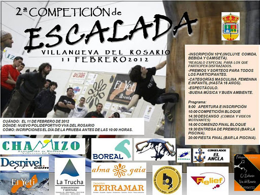 La prueba se realizo en Villanueva del Rosario, quien no lo conozca, decirle que es un sitio precioso pero un frio terrible, a las 8 de la tarde, el coche marcaba -4 grados, el rocodromo estaba en el nuevo polideportivo, un bonito escenario. La inscripción era de 10 euros y te daban una camiseta, bonita, un numero de la revista Desnivel, un libro de informacion de actividades deportivas para hacer por aquella sierra y comida, por cierto muy buena. Estupenda organización y participación.