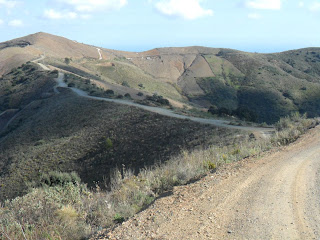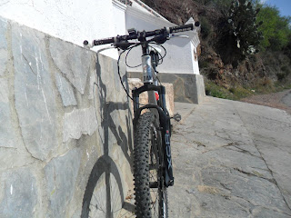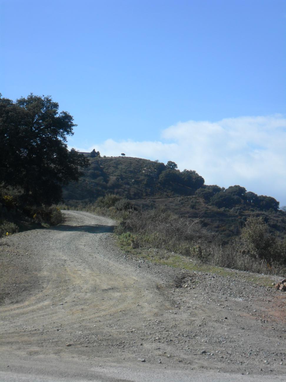 La vuelta a Velez-Málaga la hago por una linea que vi desde arriba y me enamoró, creo que el carril enlazaba con el puerto del Moclinejo por la pared de Almáchar, fácilmente reconocible por la hilera de arboles que remontan la ladera, pensé en ese momento desde la cima de Santo Pitar. Una bajada espectacular con mucha tierra suelta y un sin fin de cruces de caminos, una autentica telaraña que enlazan cualquier punto de Málaga. Una vez en la carretera de Moclinejos, cojo una nueva pista de tierra que han acondicionado, llamada Camino de la Cornisa de Los Montes de Málaga, que se une con el pueblo de Benamocarra entre otras rutas, solo queda bajar hasta Velez.