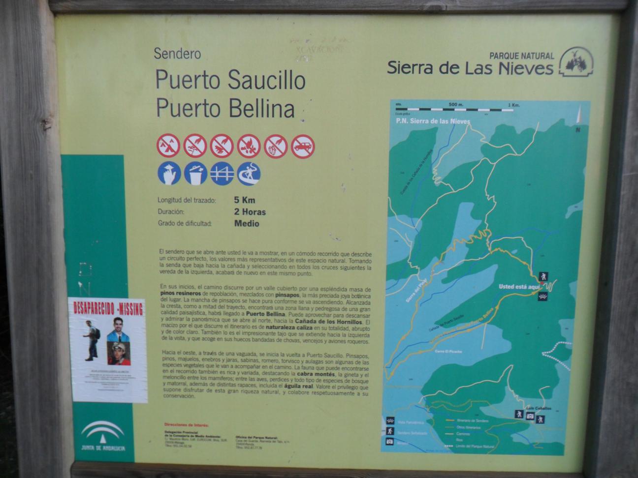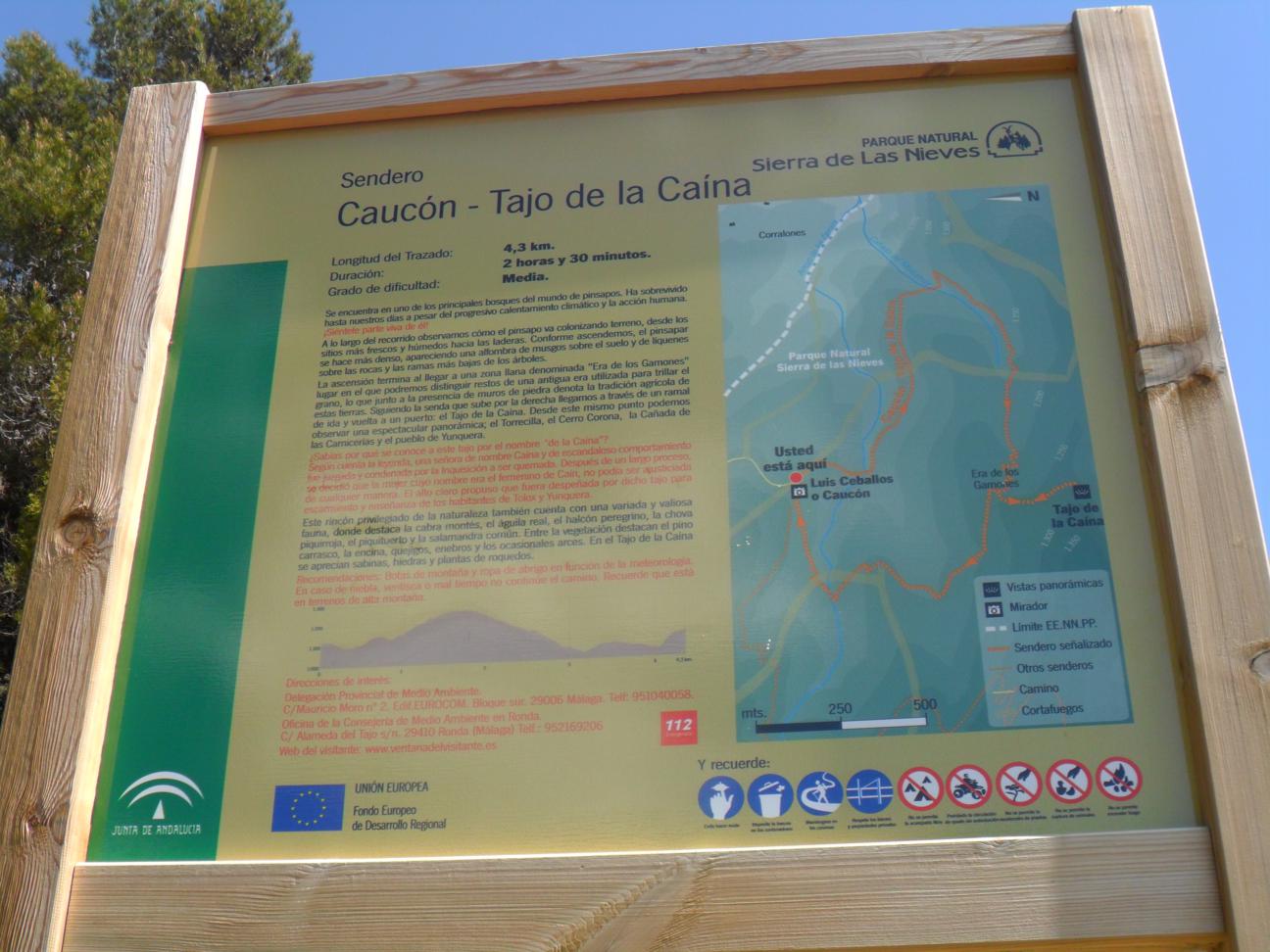mezcladas con pinos de repoblación. Por el camino nos encontramos el pinsapo candelabro de nueve brazos, con un panel informativo, tras llegar al cruce de este puerto tomamos la vereda hacia el norte que baja hacia la cañada de las Camaretas, pero tomamos la vereda de la izquierda hacia la cañada del Hornillo, para terminar subiendo hacia el Cerro de los Enamorados, sin coronarlo, me desvió por una senda hacia el emblemático “Tajo de la Caina” otro de los rincones míticos de este Parque natural de la Sierra de las Nieves hasta terminar en Caucon, conocido como mirador Luis Ceballos. De aquí hasta el Puerto Saucillo donde tengo el coche por la pista forestal de tierra.
