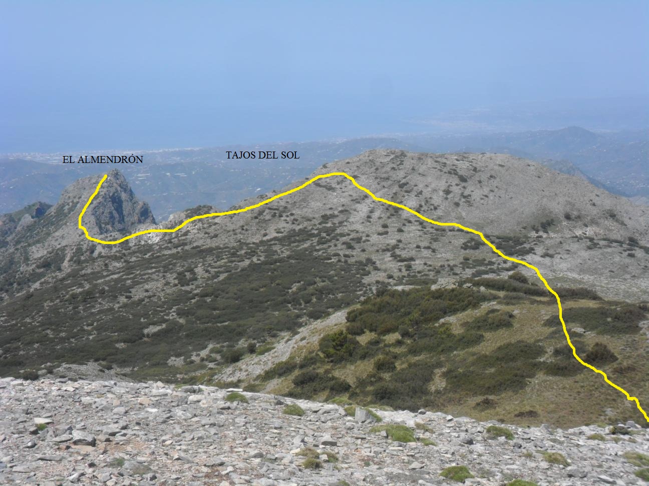 No merece la pena que describa todos los cruces de esta ruta porque los senderos están muy bien señalizados con mojones de piedras, donde no los hay, se intuye el sendero, está un poco más perdido desde el Pico del Cielo al Navachica pero sin mucha dificultad. La parte final de la subida al Pico del Cielo es un poco dura. En la bajada por los Tajos del Sol hay un destrepe donde hay que prestar un poco más de atención de lo normal. La subida al Almendrón es muy bonita, con algunos pasos aéreos. La bajada es dura con el terreno muy suelto. Practicamente durante todo el recorrido te vas arañando las piernas, pero ya debemos estar acostumbrados los que transitamos por aquí. Por último lo que quiero resaltar son las espectaculares vistas que tiene toda la ruta, desde que empiezas subiendo el Pico del Cielo hasta que estás bajando por el Almendrón, vuelvo a repetir, son dignas de ver alguna vez.
