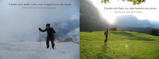 El tren que me conduce al bonito pueblo de Engelberg, está lleno de turistas. Mi primera impresión es la de "voy a caminar acompañado" pero más allá de la realidad, toda las personas se dirigen a los telecabinas, así es que sin darme cuenta, me veo solo atravesando el pinar por el que empieza el sendero. Al salir del bosque, mi primera confusión. No llevo planos ni mapa, espera ver una indicación en los múltiples paneles que pusiera "Titlis". No la encontré, por suerte había un pastor que con la mano me indicó el camino. Las pendientes son elevadas, el desnivel ha superar son unos 2.200 metros. Hubo un momento muy especial para mi, cuando atravesaba una pendiente de nieve muy inclinada, pasaba por debajo de la linea de telecabinas, donde pude escuchar las voces de las personas animandome, pude ver los gestos de los brazos por las ventanas de los telecabina dandome ánimos por llegar hasta arriba.