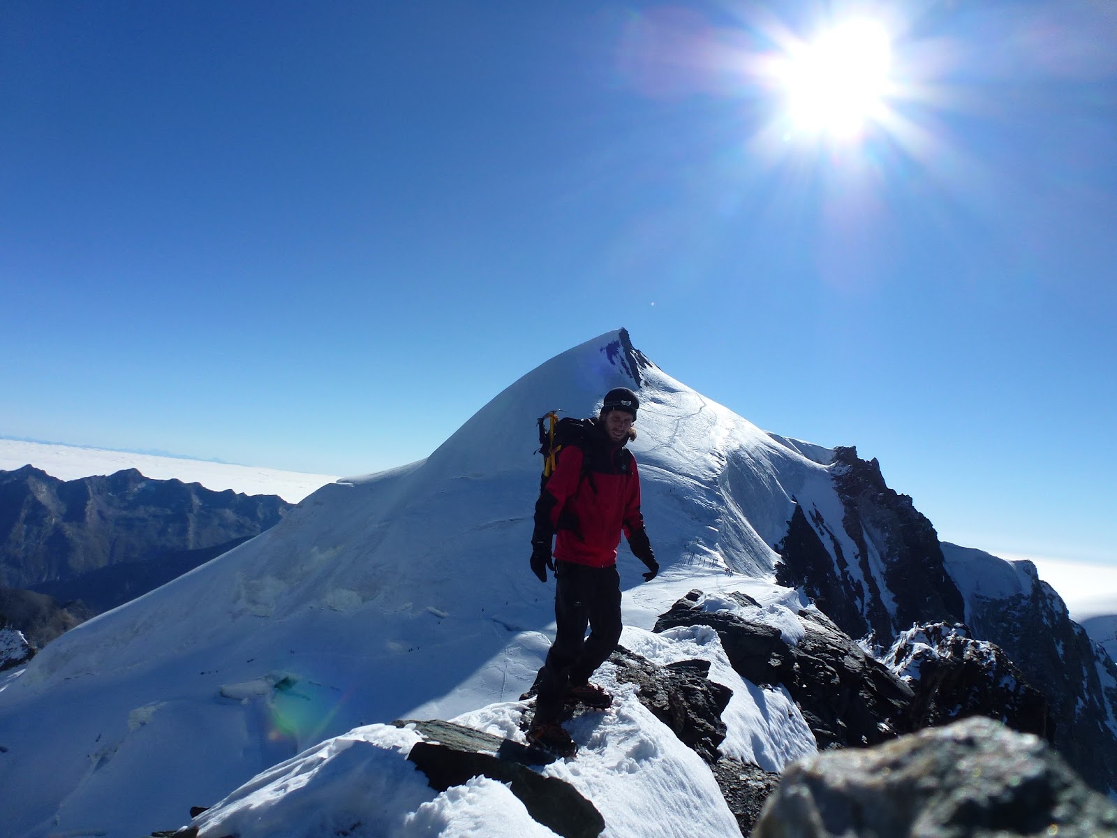 Bajé al Feejoch (3.810 metros), desde ese punto vi como subía mucha gente encordadas desde el Mittelallalin (Estación Alpina a 3.456 metros). Como si quisiera evitar a la multitud continué por la cresta aérea de roca Feechopf con pasos de grado II+. Un mirador hermoso entre Alphubel y Allalinhorn. Una vez en Alphubeljoch, crucé el glaciar para continuar por una preciosa cresta aérea de hielo para ir directamente a la cima del Alphubel, la última parte con pendiente de 50º. Es una cima muy amplia, aunque llegaban cordadas eufóricas detrás mía, pude disfrutar de ella durante mucho tiempo, aislado de todo.