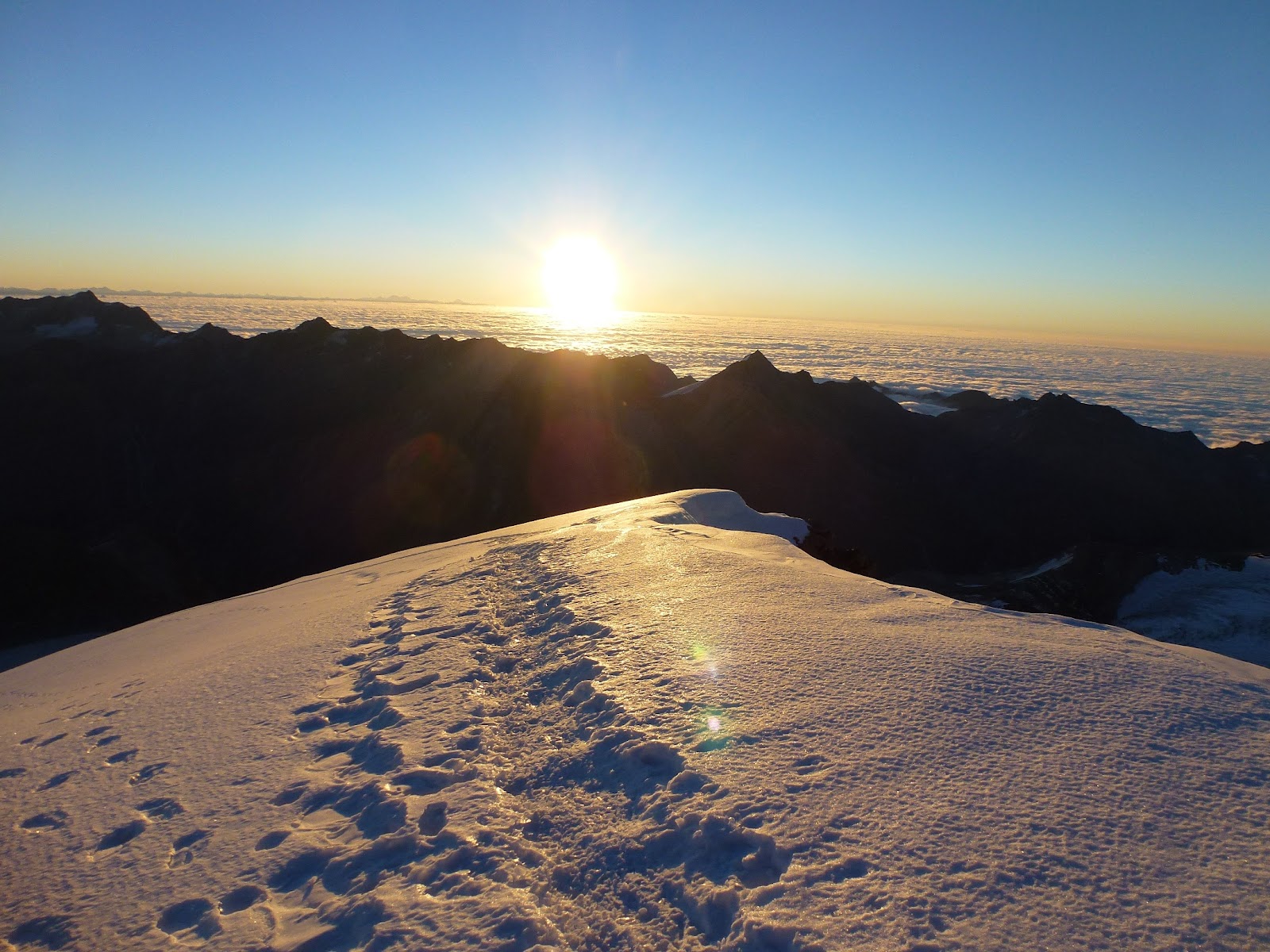 La noche la he pasado en un vivac a unos 3.000 metros cerca del Glaciar Hohlaub, he pasado mucho frió, bien repartido por todo el cuerpo, no ha sido culpa del tiempo, simplemente mi saco no da para las exigencias de estas montañas. A las 3:30 am. tuve que ponerme en marcha porque no podía estar tumbado, no dejaba de tiritar. Estuve mucho tiempo por el glaciar esquivando grietas, quería volverme, debía volverme pero no lo hice. Mis ojos se aferraban a la luz del frontal, para encontrar un camino, hasta encontrar una pendiente de nieve para superarla haciendo zig-zag y poder alcanzar la arista. Al llegar a un collado empezó a amanecer, las montañas de los Alpes están todas vestidas de blanco, parecían pintadas en un cuadro. A partir de este collado empezó una arista aérea con una pendiente de 40º hasta llegar al punto clave. El Allalinhorn no es una montaña difícil, pero tiene su peligro, como tantas otras. Para llegar a la cima hay que escalar una pared de roca de unos 40 metros de grado III o IV. La brisa del alba acariciaba mi cara, los primeros rayos del sol se reflejaban en la roca fría, tengo que reconocer que me puse un poco nervioso, tuve miedo, esos 40 metros de roca a 4.000 metros me separaban de la cima y me encontraba solo.