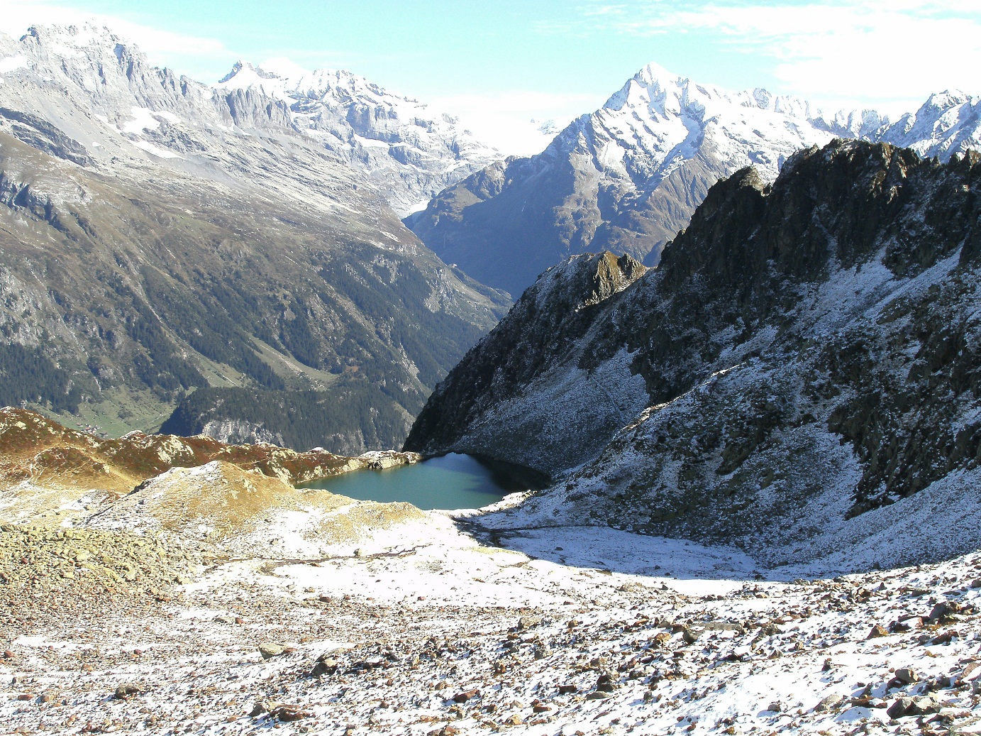 Con mucho trabajo conseguí llegar a la cima. Como no tenía mucha confianza en el terreno, la bajada la hice por el mismo lugar hasta el Bristensee, después ascendí al Chli Bristen y bajé ha Golzern, Talstation Seilbahn, un poco más largo el camino, que discurre por el otro Valle, pero con unas vistas espectaculares.