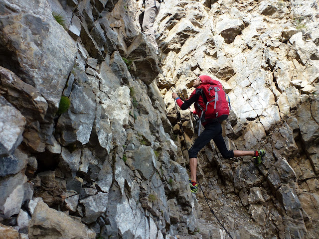 | Escalando el Spitzmeilen con cuerdas fijas montadas. |