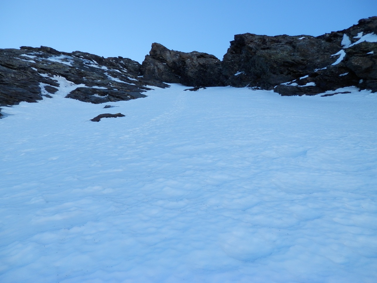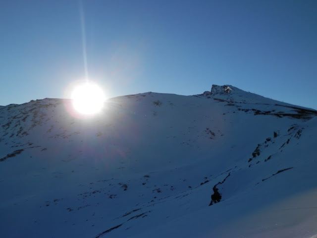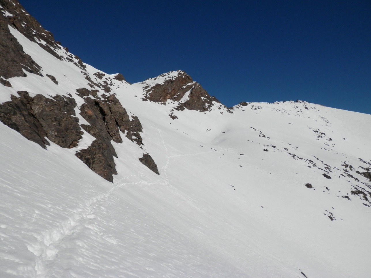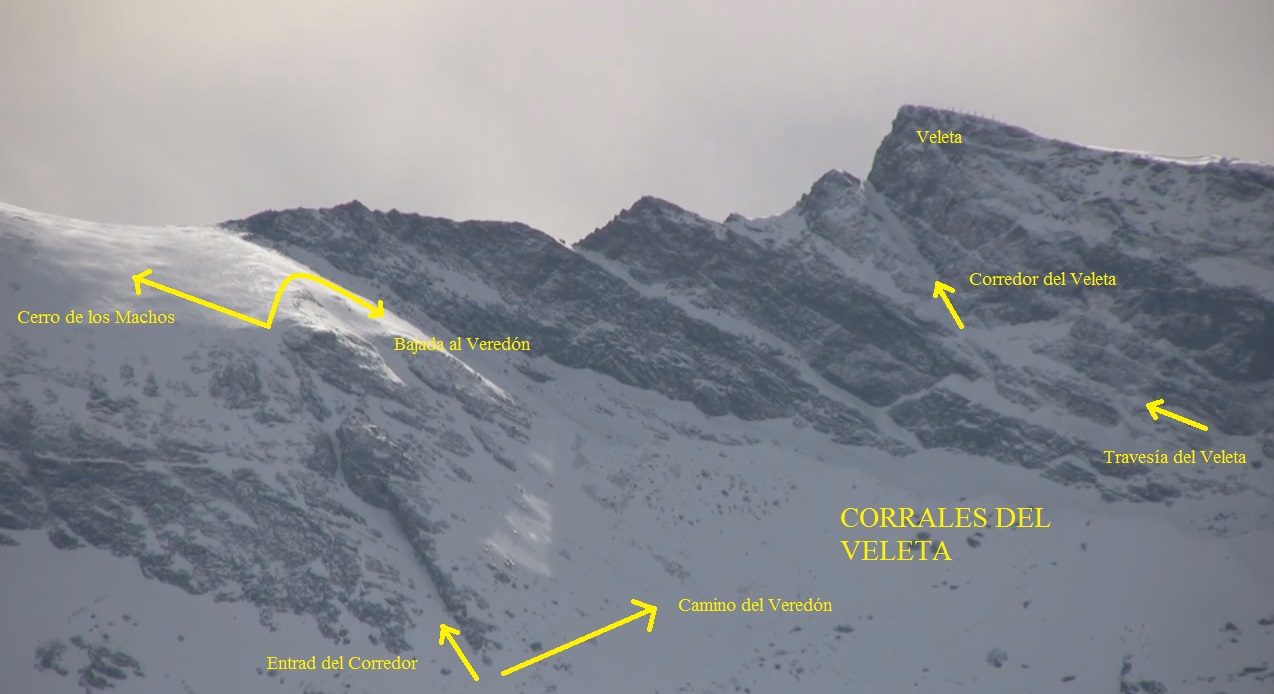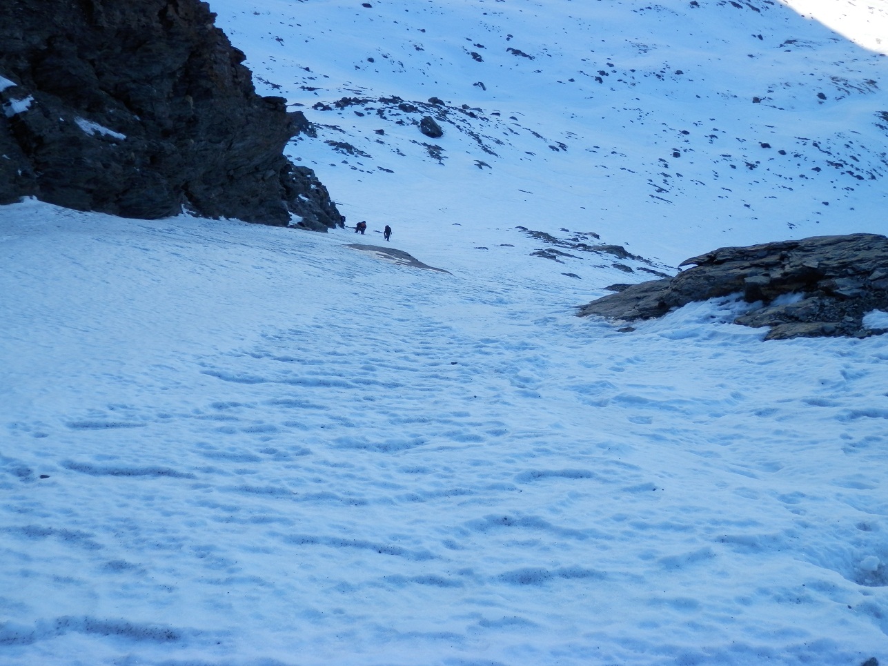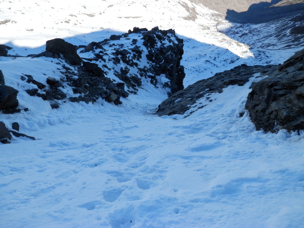 transformándose poco a poco en hielo en la parte final. La subida a la loma totalmente hielo. La vuelta, la realice por los Vasares de la Cara Sur del veleta, hasta el refugio Vivac La Carihuela y luego bajas a los Albergues.