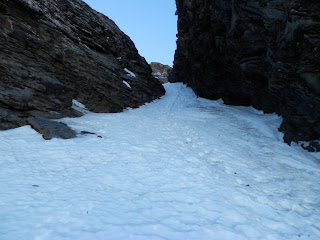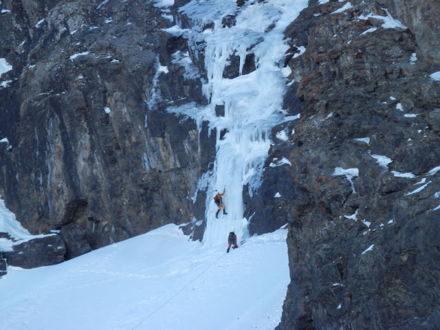 sin transformar debajo. En algunos tramos te hundías bastante. Me "asome" a las cascadas que se forman en la Cara Norte de Los Machos, es una preciosidad contemplarlas, al igual que ver como una cordada avanzaba. En la entrada me encontré a 4 personas o dos cordadas, que iban a subir también, yo le tiré primero y ya no los vi. La entrada del canuto con nieve