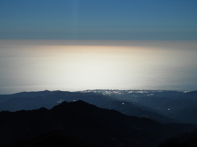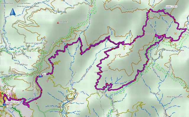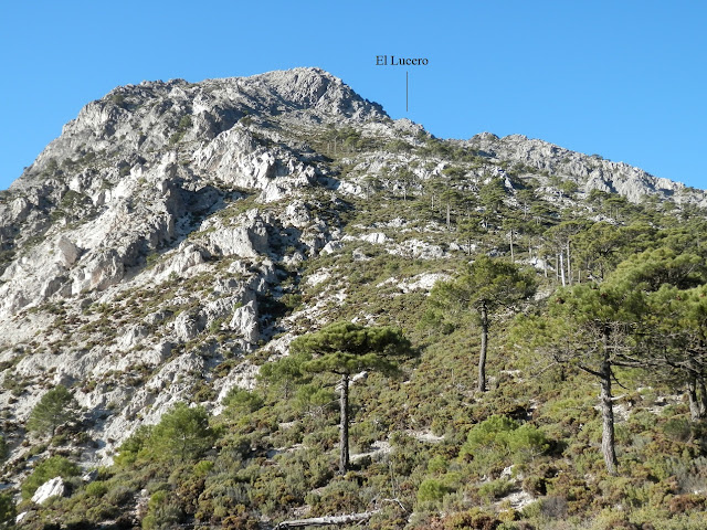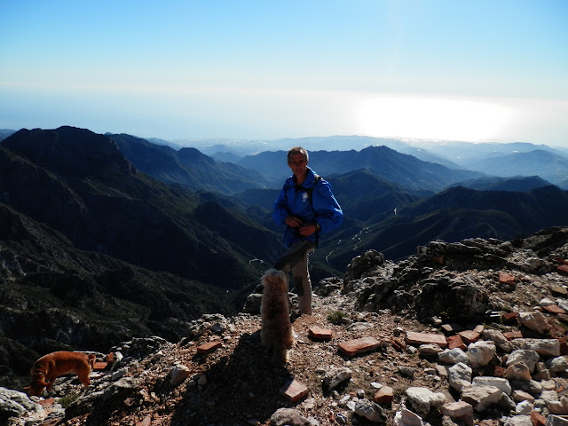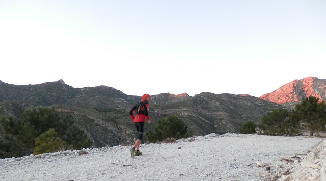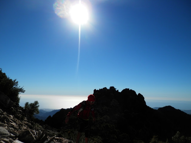 desarrollando perpendicularmente a la línea de costa. Sentado, mirando hacia el Sur había un hombre de unos 50 años, acompañado de cuatro perros, su nombre es Jose Miguel Roldan Cobos, resultó ser un corredor de ultrafondo, ha corrido entre otras carreras, la Marathon de Sables y ha quedado primero de su categoría en los 101km de Ronda, con un tiempo de diez horas, ahí queda eso... Ha sido un placer conocerlo y charlar con el, tenemos mucho que aprender de las personas mayores. Me apetecía mucho acompañarlo un tramo, cuando le pregunté que por donde iba a bajar, me dijo que por aquí, señalando la Cara Este del Lucero, un tramo sin senda, campo a través. Me sorprendió mucho su agilidad y forma física, además de como se planteaba las salidas a la montaña en solitario, donde pasa la mayor parte de su tiempo. En el Puerto de Frigiliana nos despedimos, él cogió una senda que rodea la base del Lucero hasta la Cantera de Mármol, y yo continué por el alto Valle del Higuerón - Venta Panaderos - Puerto Blanquillo, donde volví a la pista para continuar hacia Puerto Paez Blanca - Barranco de Majadillas - Cortijo del Daire y Competa.