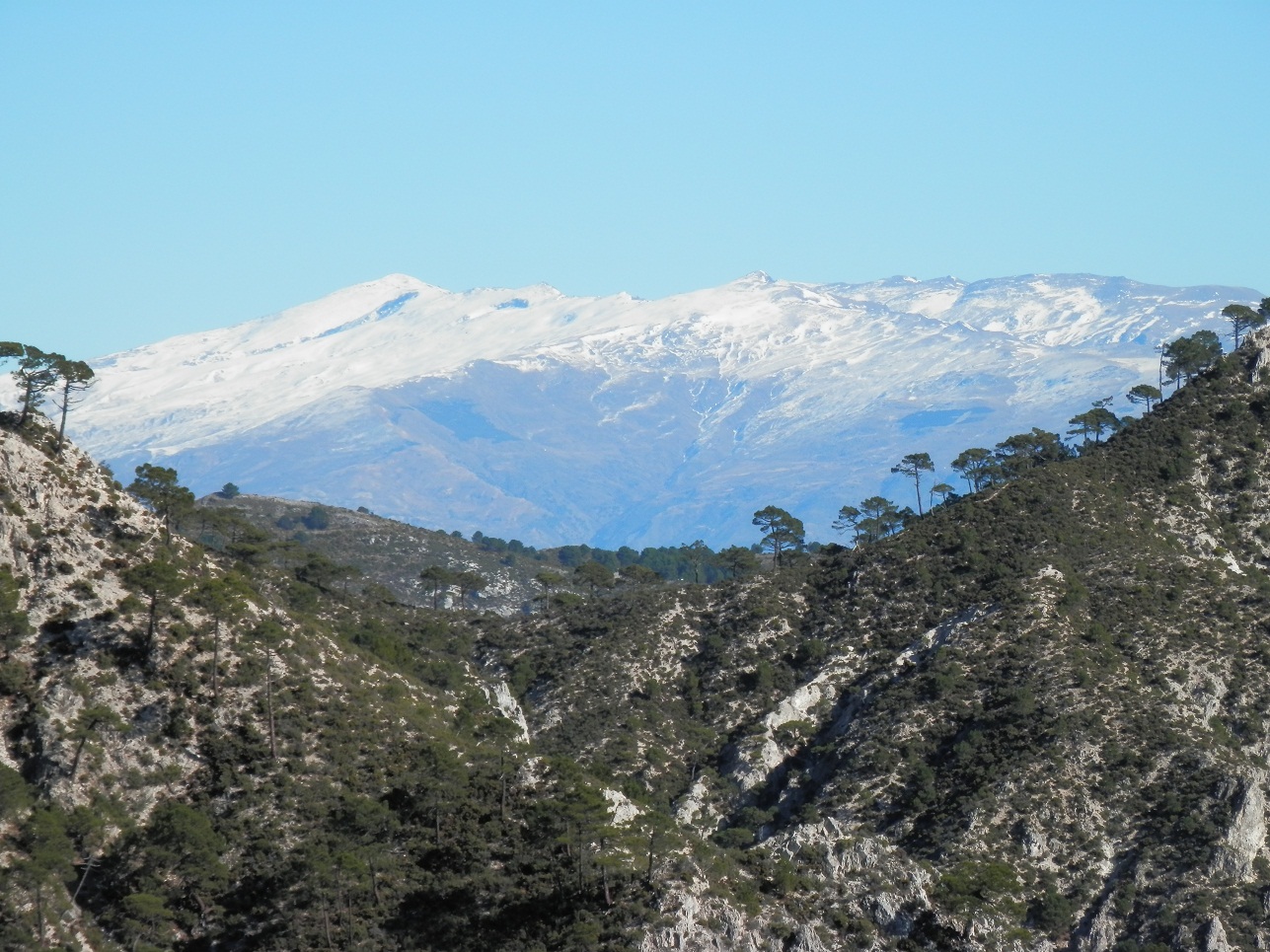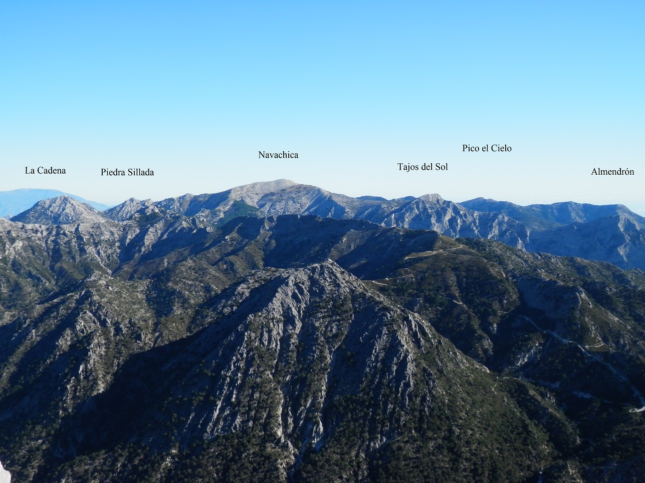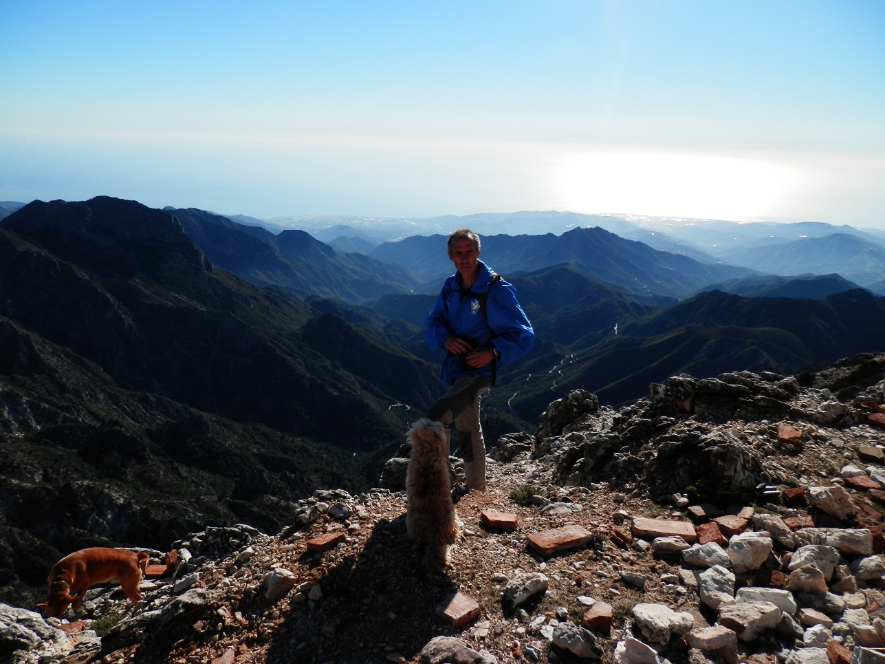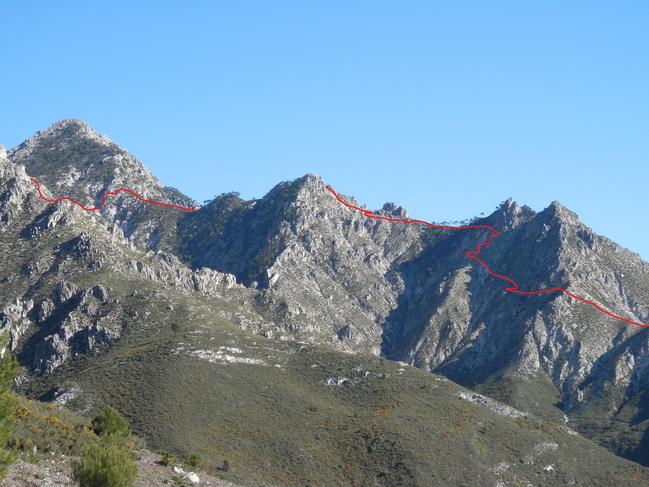 desarrollando perpendicularmente a la línea de costa. Sentado, mirando hacia el Sur había un hombre de unos 50 años, acompañado de cuatro perros, su nombre es Jose Miguel Roldan Cobos, resultó ser un corredor de ultrafondo, ha corrido entre otras carreras, la Marathon de Sables y ha quedado primero de su categoría en los 101km de Ronda, con un tiempo de diez horas, ahí queda eso... Ha sido un placer conocerlo y charlar con el, tenemos mucho que aprender de las personas mayores. Me apetecía mucho acompañarlo un tramo, cuando le pregunté que por donde iba a bajar, me dijo que por aquí, señalando la Cara Este del Lucero, un tramo sin senda, campo a través. Me sorprendió mucho su agilidad y forma física, además de como se planteaba las salidas a la montaña en solitario, donde pasa la mayor parte de su tiempo. En el Puerto de Frigiliana nos despedimos, él cogió una senda que rodea la base del Lucero hasta la Cantera de Mármol, y yo continué por el alto Valle del Higuerón - Venta Panaderos - Puerto Blanquillo, donde volví a la pista para continuar hacia Puerto Paez Blanca - Barranco de Majadillas - Cortijo del Daire y Competa.