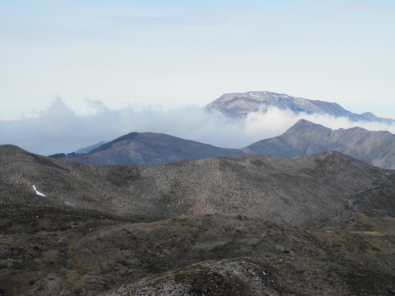 Como no tengo el coche disponible, estos días grises los paso en bicicleta y corriendo, pero el gesto de Paco Farinas, ha cambiado el color de las cosas. El Domingo vino desde Algarrobo, siendo la primera vez que íbamos juntos, a recogerme a Velez-Málaga para subir en su vehículo hasta el Puerto Blanquillo con la idea de hacer algún pico o cerro de los muchos que tenemos en nuestra querida sierra. El elegido fue el Cerro de las Chapas de 1.832 metros, máxima cota de la sierra de Játar. La subida la hicimos por el puerto de Competa, seguidamente de un cortafuegos para terminar campo atraves hasta el cerro de las Chapas, que tiene dos picos, uno donde se encuentra el vértice geodésico y otro en el que se encuentra una caseta pararrayos. La bajada la hicimos hacia el collado donde se divide el carril a las Llanadas de Sedella, Barranco de Malinfierno y camino del Nevazo. Antes de seguir descendiendo nos desviemos a visitar el cortijo de la Haza del Aguadero, así llamado por confluir en la zona varios manantiales y regatos que alimentan el barranco de Malinfierno, a la postre la cabecera o nacimiento del río de Alhama o Merchant. En el horizonte el Malascamas (1.792 m) se alza sobre nosotros, donde decidimos que vendríamos en la próxima salida juntos. Si las paredes hablaran, conoceríamos innumerables y apasionantes historias de arrieros que pasaron por estos cortijos. Retrocedimos nuestros pasos para bajar por el Cortijo del Nevazo y llegar a la pista que se dirige hacia la Cruz del Muerto y Puerto Blanquillo.