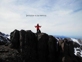 Empezamos a descender por la arista norte que no presenta grandes complicaciones hasta llegar a las pendientes que nos llevan al collado norte a 3.950 metros. Desde aquí vamos a buscar una especie de collado a la izquierda del Imouzzer que cruza hacia el llamado circo del Tikint-n-Ouanas. Desde este punto seguimos en dirección este el cordal hasta llegar a un primera punta separada de la cima principal por una marcada brecha de unos 10 m. Destrepamos por la izquierda, aunque también se puede por la derecha y realizamos un pequeño flanqueo hasta el fondo de la brecha. Unos pocos metros de trepada fácil nos separan de la cumbre del Imouzzer (4.010 m). Cabe destacar la vista de la poderosa y rocosa vertiente NE del Toubkal y del valle de Imlil a más de 2.300 metros de desnivel de nuestros pies.