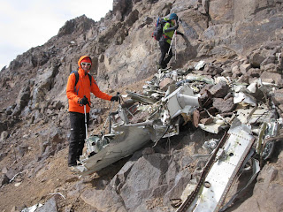 Con cuidado volvemos a deshacer el camino realizado, mi amigo Paco, le hacía mucha ilusión, encontrar los restos del avión que se estrelló en 1969, donde murieron 8 personas, así que como bien nos habían indicado, se encontraban en la ascensión a un pico cerca del collado donde nos encontrábamos, por suerte para todos, dimos con los restos y justo en la cima, se encuentra algo como poco sorprendente, el motor. La bajada la hicimos directa hasta el Ikhibi norte en dirección al refugio. La bajada es muy similar al valle sur pero está vez mucho más tranquila y sin restos de huella ni camino. Desde el collado norte descendemos por la vertiente derecha del valle para salvar un resalte rocoso que corta la parte izquierda del valle. Una vez superado, el valle se orienta hacia el NW y llegamos a un balcón que preside el Assif Mizane (río principal) y desde donde divisamos a nuestra izquierda el llano del refugio. Hacia allí nos dirigimos mediante un flanqueo en diagonal descendente. Llegamos al refugio después de una estupenda ruta circular y tres cimas de 4.000 metros ascendidas, pero lo mejor del día fue la compañía y el trato tan bueno que he recibido de este grupo.
