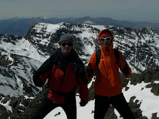 La bajada la hacemos por la ruta normal de subida, ya en el collado nos quitamos los crampones debido a la escaza nieve que divisamos en la subida al Toubkal, al llegar a un falso collado, a la espalda, se encuentra una pala de nieve de unos 500 metros bastante helada, yo opto por subir por otra ruta alternativa que va por la arista y así no tener que ponerme los crampones, justo donde se unen las dos variantes, encaramos los últimos metros por pendientes suaves hasta llegar a los 4.167 metros de la cumbre más alta del norte de África, el Toubkal. Las vistas son extraordinarias, nos rodean todas las cimas del circo: al oeste, de sur a norte, nos observamos el Timesguida, Ras, Akoiud, Afella, Biiguinoussene, Tadat y Alguelzim. Hacia el norte vemos la larga cresta NE hasta el Tichki, pasando por Imouzzer y Afekhoui. Si el día es claro divisaremos hacia el sur la cadena montañosa del Anti-Atlas justo delante de las primeras extensas llanuras del Sahara, 3500 metros por debajo nuestro. Al oeste el conjunto de los Ouanoukrims y el Tazaghârt, cuyas alturas nos limitarán el alcance de la vista, y al este el largo cordal del Alto Atlas Central con macizos tan importantes como el Jbel Rat, Tignousti y el Mgoun.