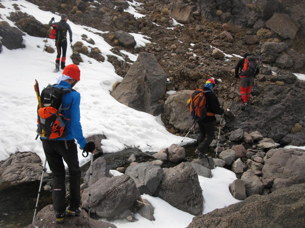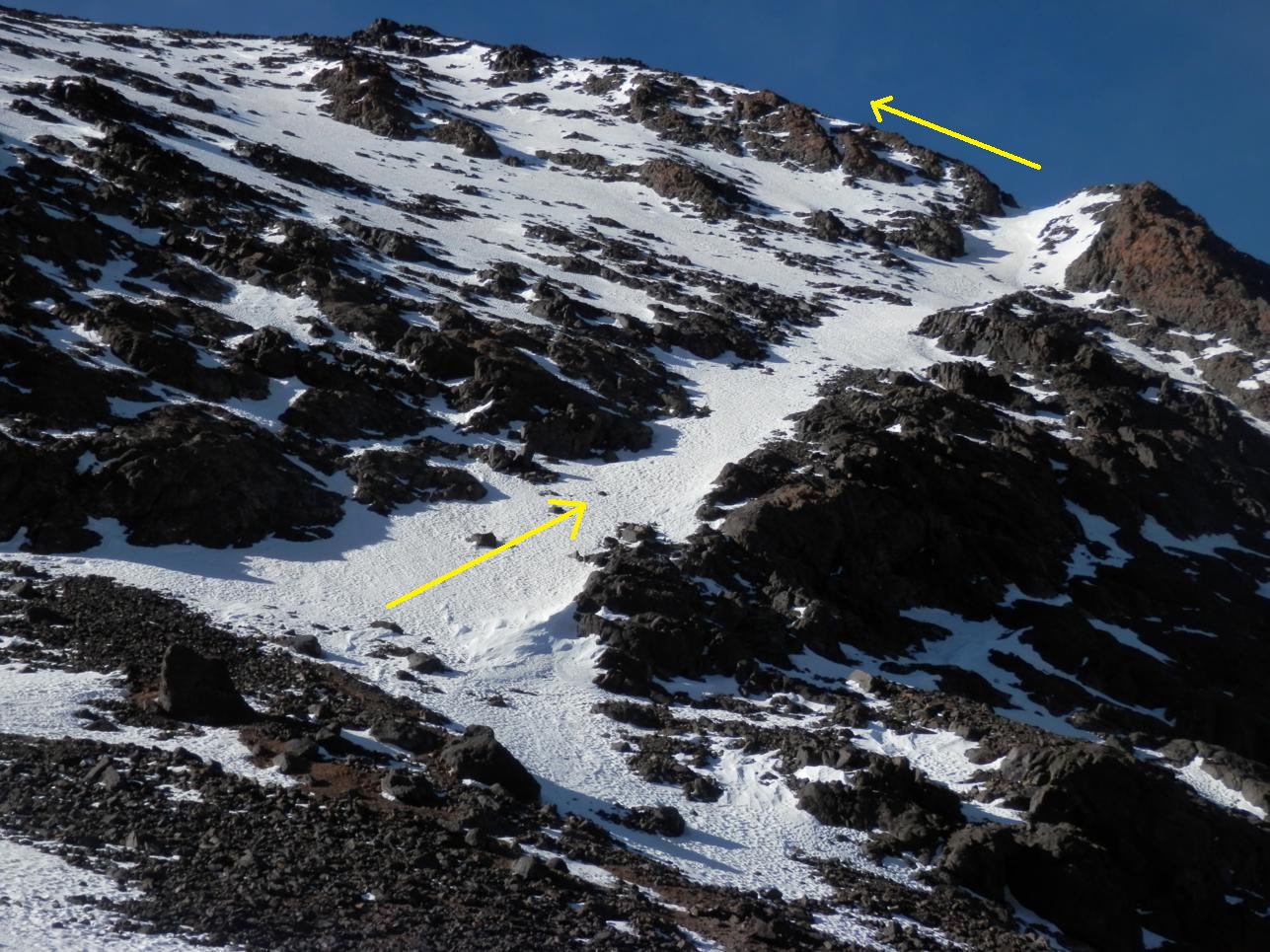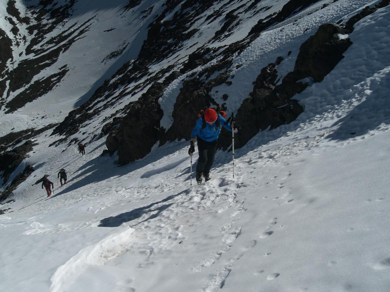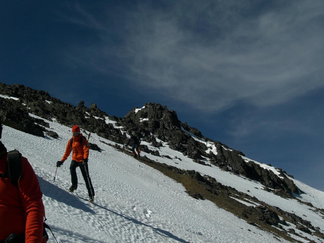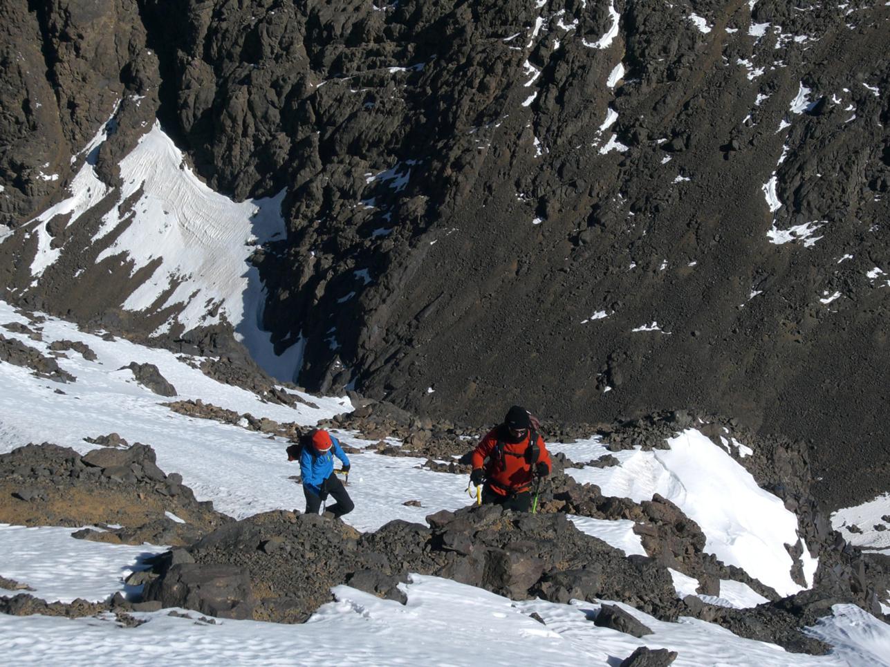 Empezamos a descender por la arista norte que no presenta grandes complicaciones hasta llegar a las pendientes que nos llevan al collado norte a 3.950 metros. Desde aquí vamos a buscar una especie de collado a la izquierda del Imouzzer que cruza hacia el llamado circo del Tikint-n-Ouanas. Desde este punto seguimos en dirección este el cordal hasta llegar a un primera punta separada de la cima principal por una marcada brecha de unos 10 m. Destrepamos por la izquierda, aunque también se puede por la derecha y realizamos un pequeño flanqueo hasta el fondo de la brecha. Unos pocos metros de trepada fácil nos separan de la cumbre del Imouzzer (4.010 m). Cabe destacar la vista de la poderosa y rocosa vertiente NE del Toubkal y del valle de Imlil a más de 2.300 metros de desnivel de nuestros pies.