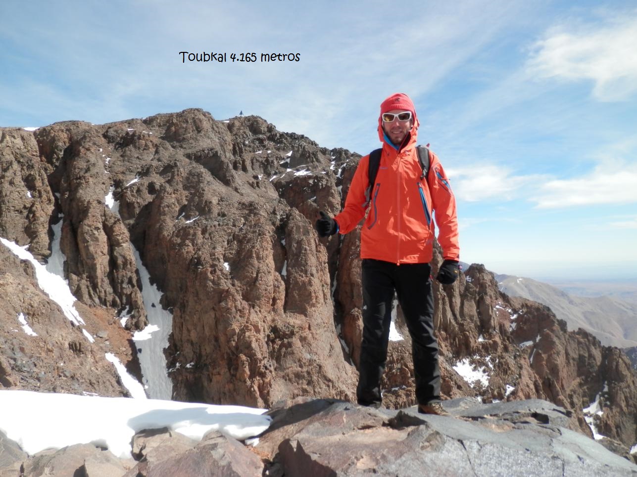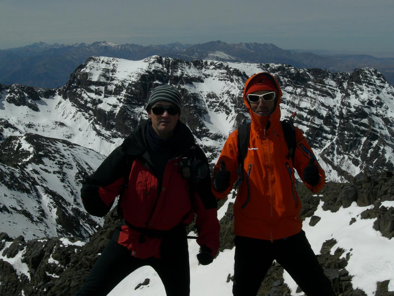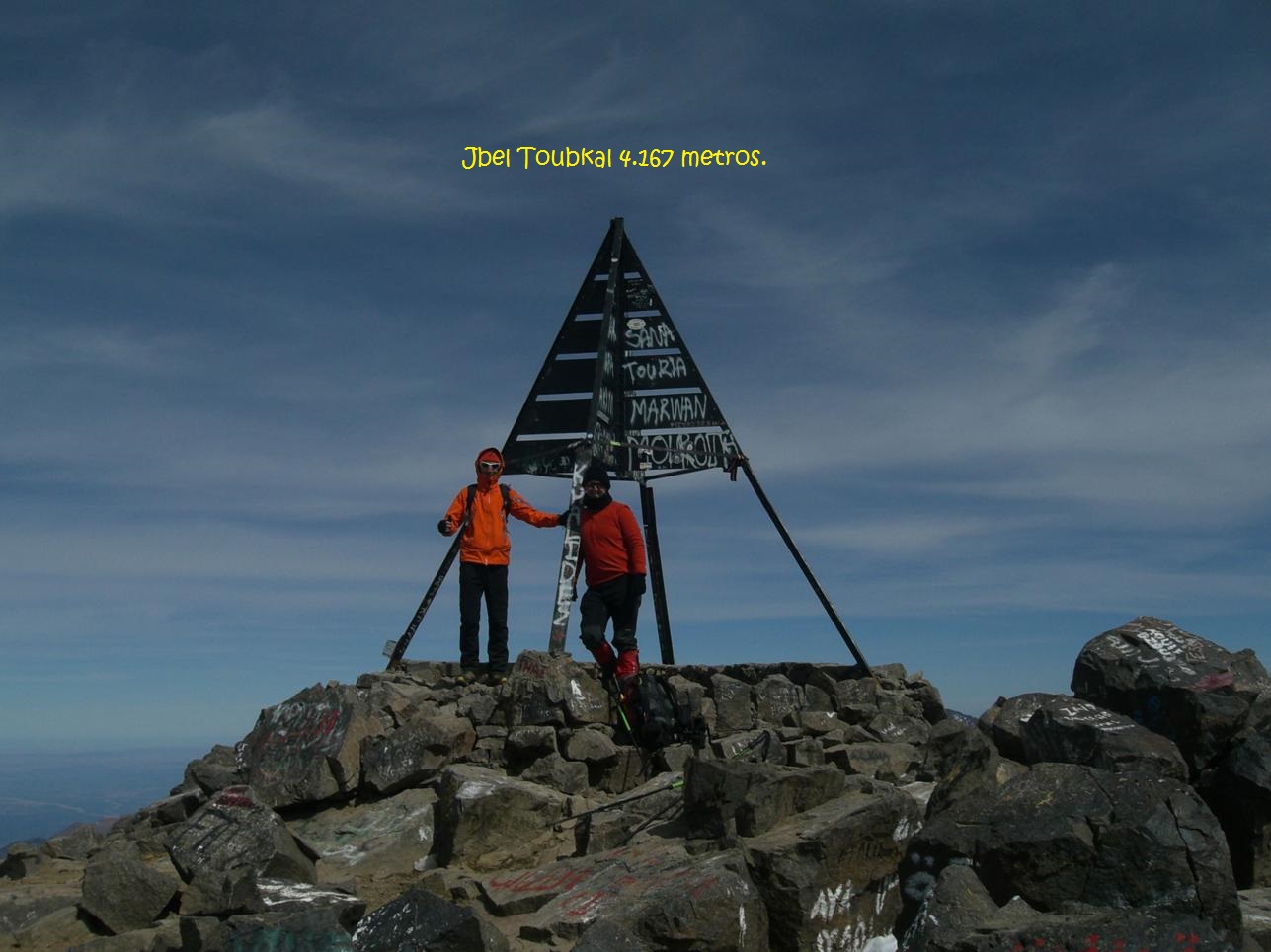 La bajada la hacemos por la ruta normal de subida, ya en el collado nos quitamos los crampones debido a la escaza nieve que divisamos en la subida al Toubkal, al llegar a un falso collado, a la espalda, se encuentra una pala de nieve de unos 500 metros bastante helada, yo opto por subir por otra ruta alternativa que va por la arista y así no tener que ponerme los crampones, justo donde se unen las dos variantes, encaramos los últimos metros por pendientes suaves hasta llegar a los 4.167 metros de la cumbre más alta del norte de África, el Toubkal. Las vistas son extraordinarias, nos rodean todas las cimas del circo: al oeste, de sur a norte, nos observamos el Timesguida, Ras, Akoiud, Afella, Biiguinoussene, Tadat y Alguelzim. Hacia el norte vemos la larga cresta NE hasta el Tichki, pasando por Imouzzer y Afekhoui. Si el día es claro divisaremos hacia el sur la cadena montañosa del Anti-Atlas justo delante de las primeras extensas llanuras del Sahara, 3500 metros por debajo nuestro. Al oeste el conjunto de los Ouanoukrims y el Tazaghârt, cuyas alturas nos limitarán el alcance de la vista, y al este el largo cordal del Alto Atlas Central con macizos tan importantes como el Jbel Rat, Tignousti y el Mgoun.