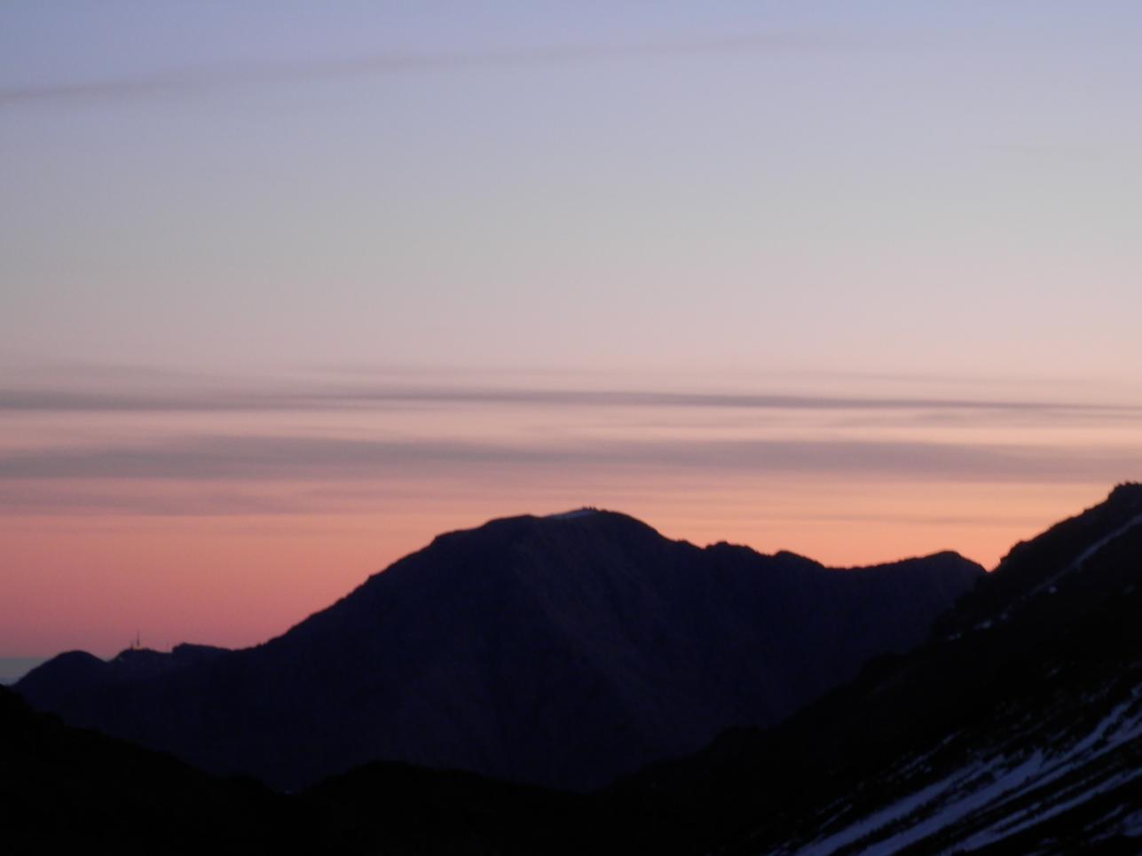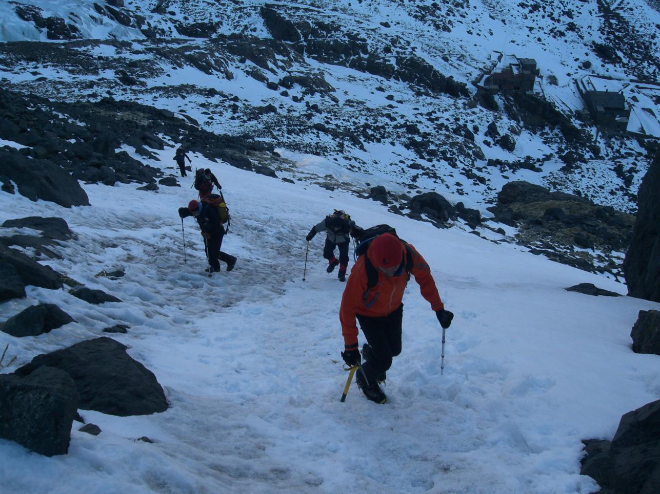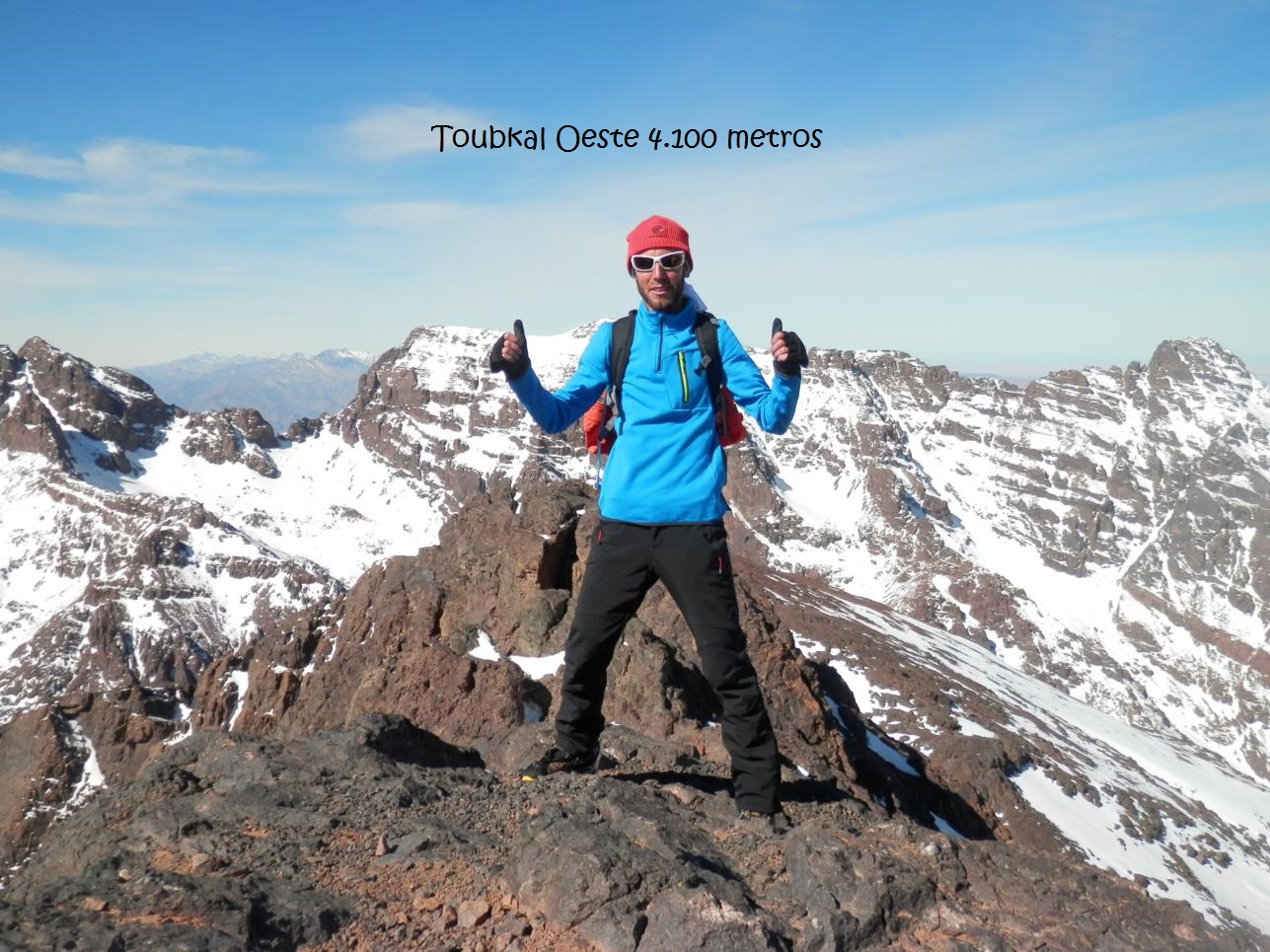 La bajada la hacemos por la ruta normal de subida, ya en el collado nos quitamos los crampones debido a la escaza nieve que divisamos en la subida al Toubkal, al llegar a un falso collado, a la espalda, se encuentra una pala de nieve de unos 500 metros bastante helada, yo opto por subir por otra ruta alternativa que va por la arista y así no tener que ponerme los crampones, justo donde se unen las dos variantes, encaramos los últimos metros por pendientes suaves hasta llegar a los 4.167 metros de la cumbre más alta del norte de África, el Toubkal. Las vistas son extraordinarias, nos rodean todas las cimas del circo: al oeste, de sur a norte, nos observamos el Timesguida, Ras, Akoiud, Afella, Biiguinoussene, Tadat y Alguelzim. Hacia el norte vemos la larga cresta NE hasta el Tichki, pasando por Imouzzer y Afekhoui. Si el día es claro divisaremos hacia el sur la cadena montañosa del Anti-Atlas justo delante de las primeras extensas llanuras del Sahara, 3500 metros por debajo nuestro. Al oeste el conjunto de los Ouanoukrims y el Tazaghârt, cuyas alturas nos limitarán el alcance de la vista, y al este el largo cordal del Alto Atlas Central con macizos tan importantes como el Jbel Rat, Tignousti y el Mgoun.