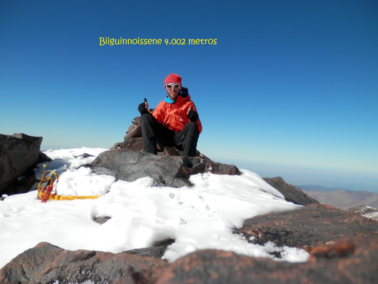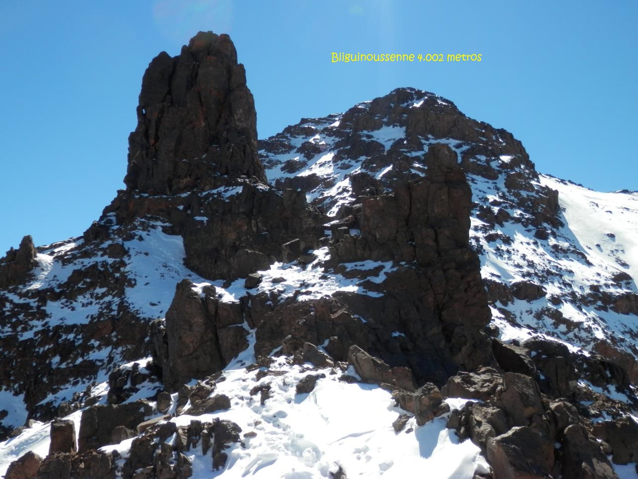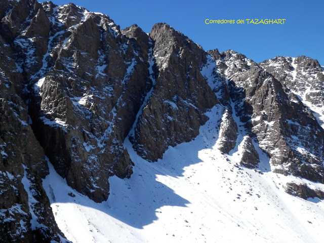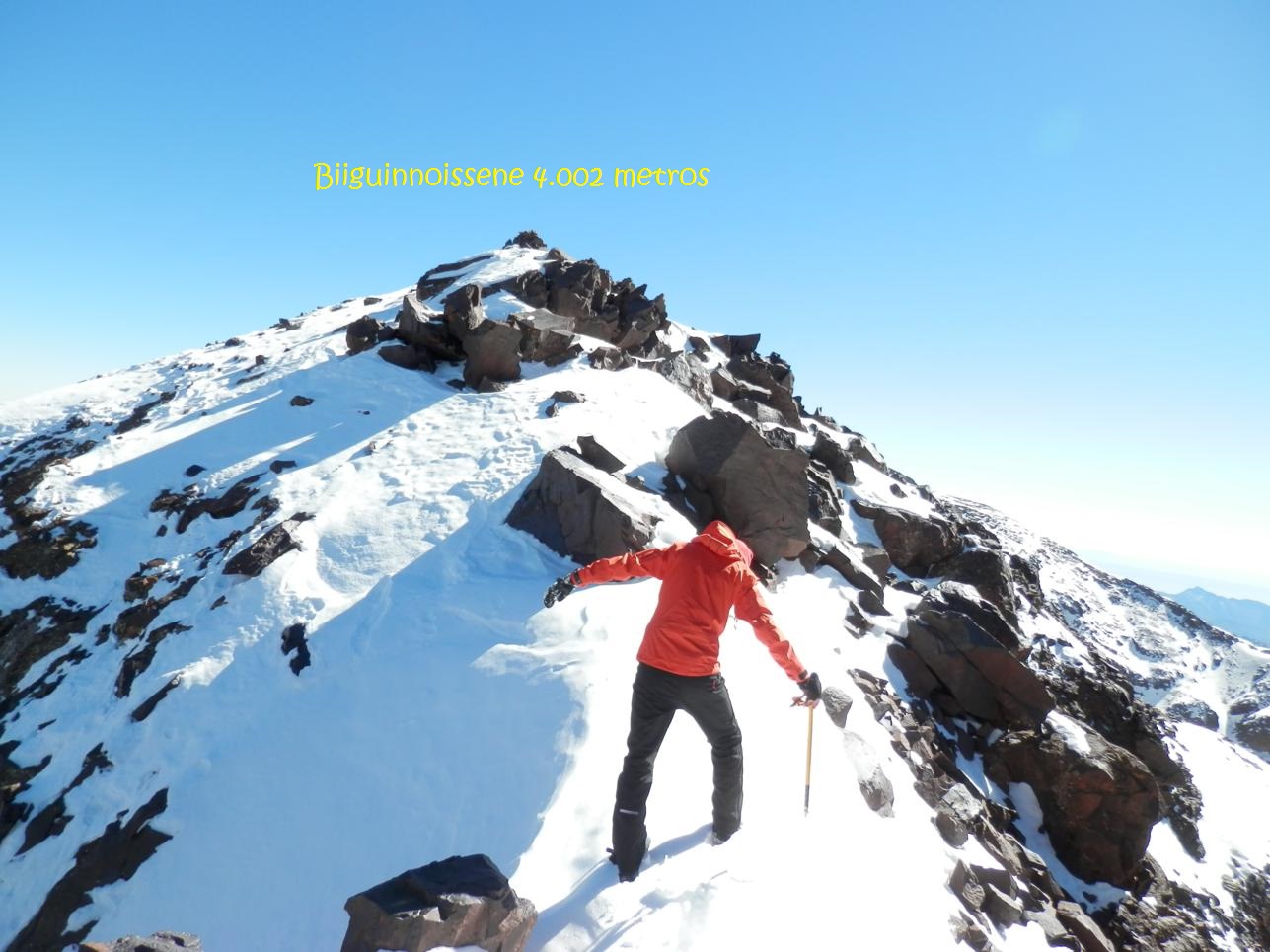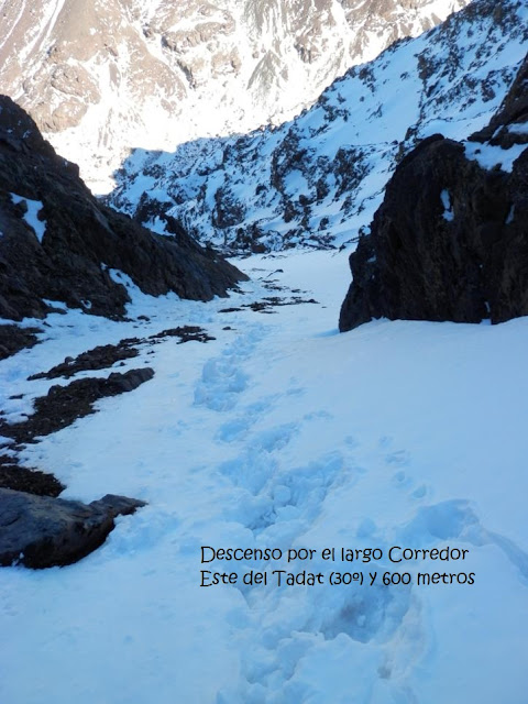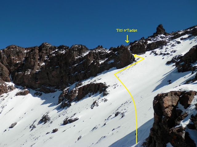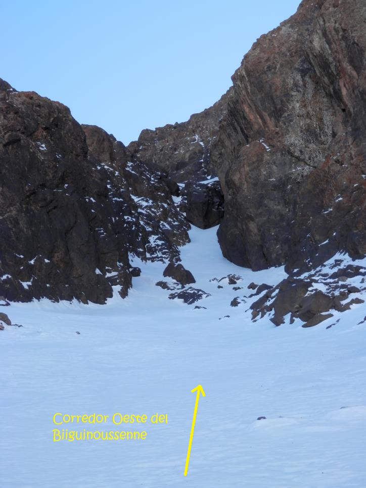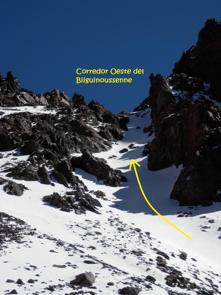 Parece ser que por donde yo he pasado, es el itinerario más frecuentado por ser el más rápido y directo entre los dos refugios. Se sale del refugio Lepiney en suave ascenso por su parte trasera y subimos por el Aougdal-n-Bouidarene, buscando el circo del Tazaghârt, una vez en él, dejamos a nuestra derecha la impresionante pared del Tazaghârt, giramos a nuestra izquierda buscando la entrada del corredor Oeste del Biiguinoussene, la entrada al corredor es muy fácil de localizar pues tiene un gran bloque de piedra empotrado que se ve de lejos, en este punto, no veía muchas facilidades, no había huellas ni señales, así que me fije a mi izquierda, arriba, había como un vasar que superaba el corredor y te dejaba a mitad de él, unos metros de trepadera para alcanzarlo y a continuación unos pasos con mucho patio hasta llegar al corredor (40º), remontar lo que queda de corredor hasta la cresta que une el Adad con el Biiguinoussene. Desde este punto, cambiamos de vertiente, hay que atravesar la parte superior del circo del Assif Timellilt en travesia diagonal hasta llegar a los pies del Tizi-n-Tadat, 3.800 metros (el dedo de Tadat) para alcanzarlo por un pequeño corredor. Una vez en el collado y presidido por el imponente Dedo del Tadat, en mi caso, dejo la pesada mochila y continuación giro hacia el Sur para encarar la cara norte del Biiguinoussene (4.002 metros). Primero rodeamos el Dedo por la izquierda y para superar las barrerass rocosas que surcan la cara hay que buscar una canaleta en diagonal que lleva directamente a la arista cimera (40º). Una vez superado el paso, seguir la bonita arista bastante horizontal, con algún tramo rocoso de trepada, hasta la punta principal, precedida por una pequeña cuerda. De vuelta en el collado, recojo la mochila y me dispongo a bajar hacia el Refugio de Neltner, descendemos el largo corredor Este del Tadat (30º), esta canal presenta una morfología muy irregular, a veces es estrecha y a veces se ensancha, y presenta numerosas ramificaciones y destrepes, si se va en compañía, cuidado con la caída de piedras. Yo me he encontrado una nieve muy blanda, incluso en alguna ocasión me llegaba hasta la cintura, menos mal que era hacia abajo. Antes del final del corredor salir hacia la derecha y en diagonal hasta dicho refugio. Satisfecho de la jornada realizada, lo mejor estaba por venir.