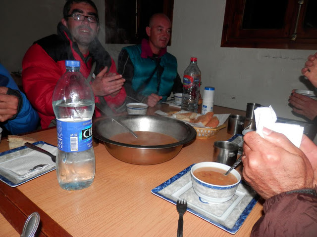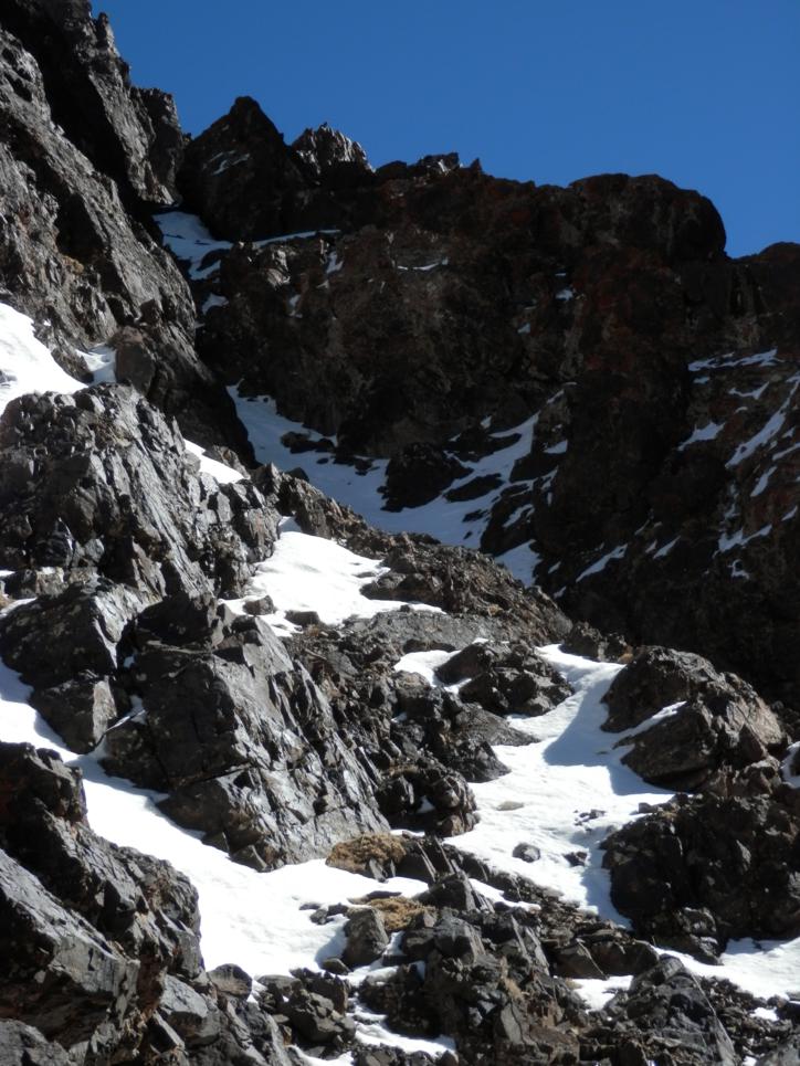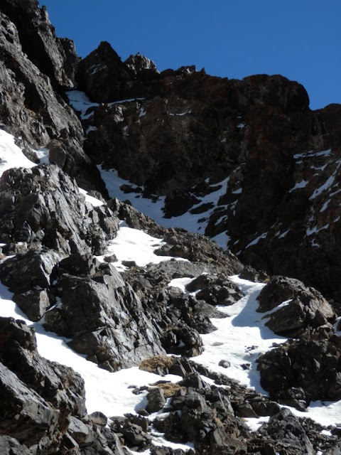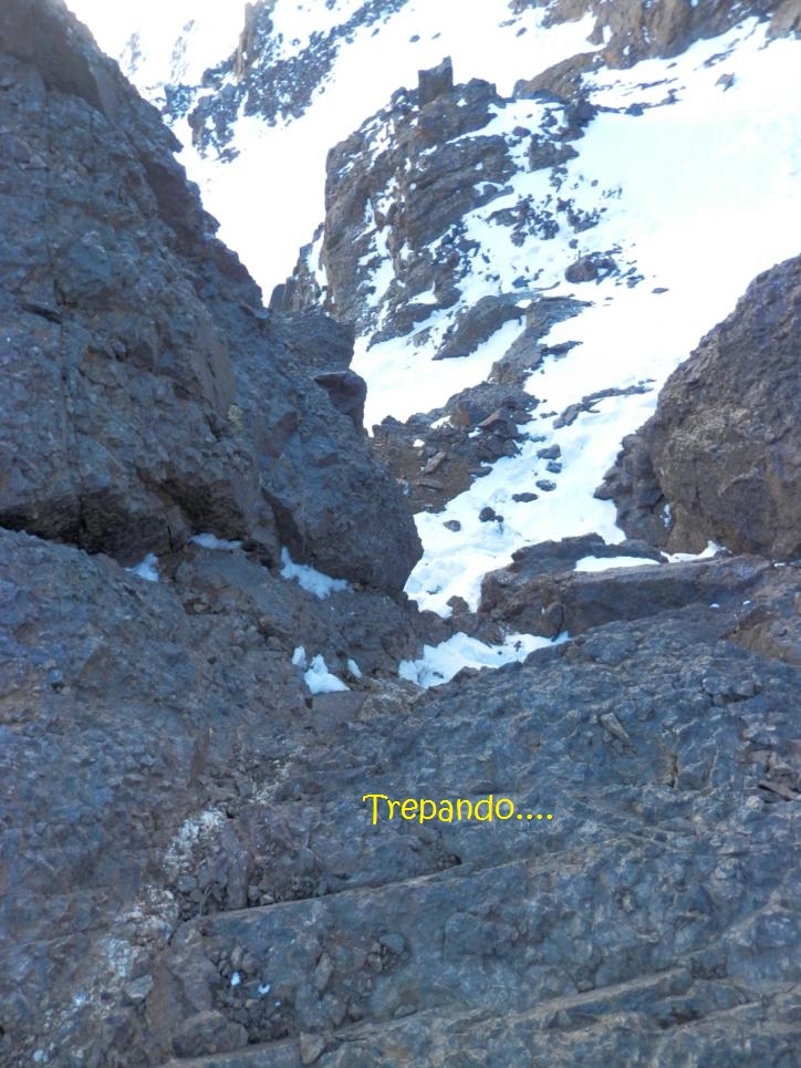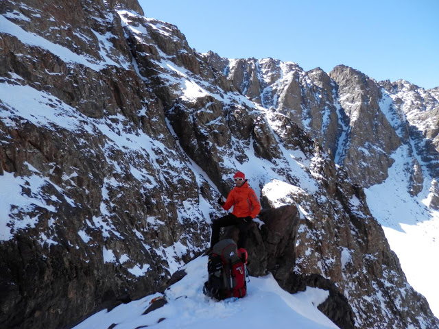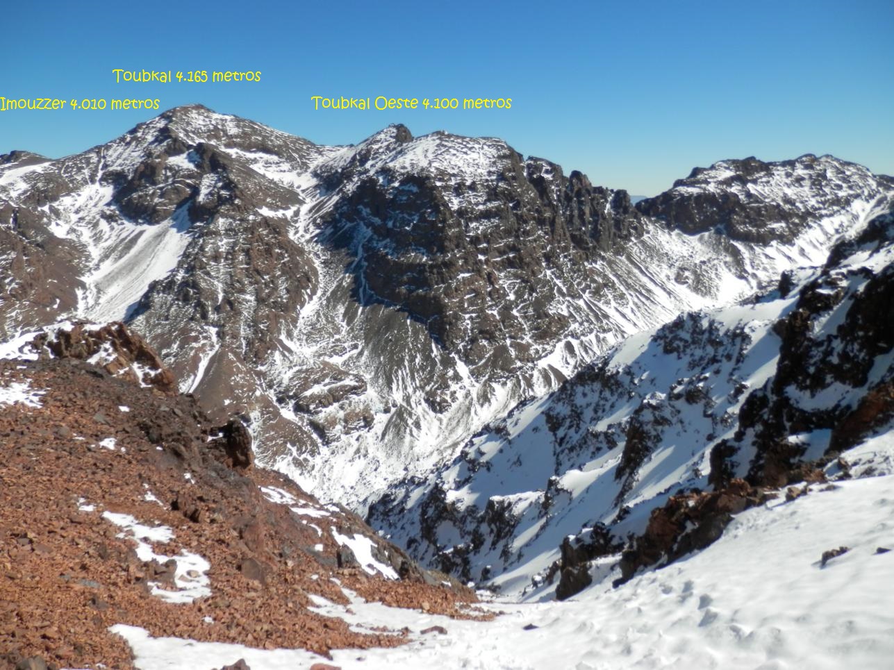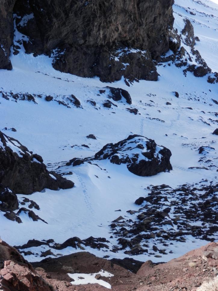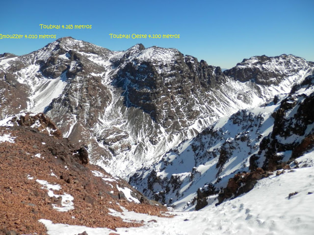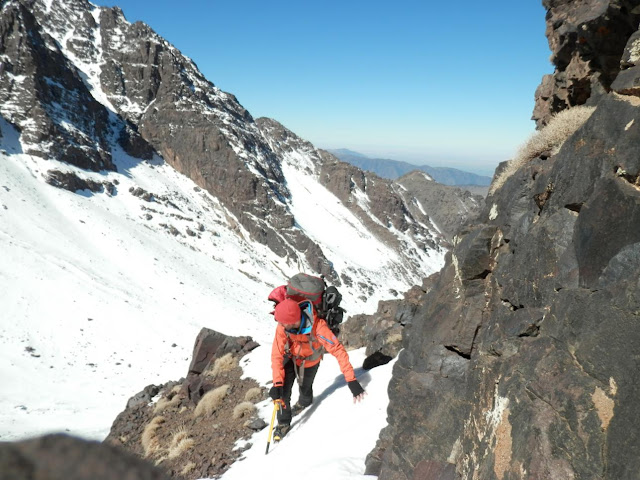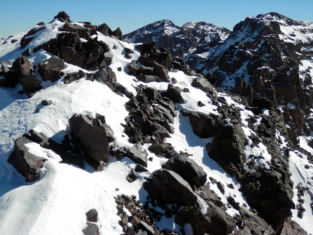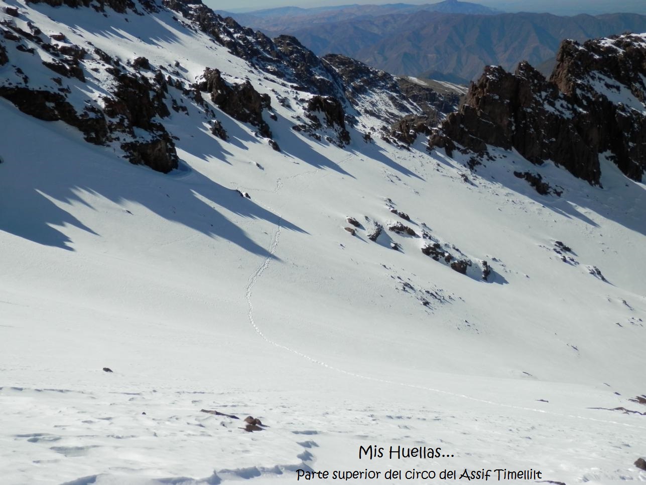 Parece ser que por donde yo he pasado, es el itinerario más frecuentado por ser el más rápido y directo entre los dos refugios. Se sale del refugio Lepiney en suave ascenso por su parte trasera y subimos por el Aougdal-n-Bouidarene, buscando el circo del Tazaghârt, una vez en él, dejamos a nuestra derecha la impresionante pared del Tazaghârt, giramos a nuestra izquierda buscando la entrada del corredor Oeste del Biiguinoussene, la entrada al corredor es muy fácil de localizar pues tiene un gran bloque de piedra empotrado que se ve de lejos, en este punto, no veía muchas facilidades, no había huellas ni señales, así que me fije a mi izquierda, arriba, había como un vasar que superaba el corredor y te dejaba a mitad de él, unos metros de trepadera para alcanzarlo y a continuación unos pasos con mucho patio hasta llegar al corredor (40º), remontar lo que queda de corredor hasta la cresta que une el Adad con el Biiguinoussene. Desde este punto, cambiamos de vertiente, hay que atravesar la parte superior del circo del Assif Timellilt en travesia diagonal hasta llegar a los pies del Tizi-n-Tadat, 3.800 metros (el dedo de Tadat) para alcanzarlo por un pequeño corredor. Una vez en el collado y presidido por el imponente Dedo del Tadat, en mi caso, dejo la pesada mochila y continuación giro hacia el Sur para encarar la cara norte del Biiguinoussene (4.002 metros). Primero rodeamos el Dedo por la izquierda y para superar las barrerass rocosas que surcan la cara hay que buscar una canaleta en diagonal que lleva directamente a la arista cimera (40º). Una vez superado el paso, seguir la bonita arista bastante horizontal, con algún tramo rocoso de trepada, hasta la punta principal, precedida por una pequeña cuerda. De vuelta en el collado, recojo la mochila y me dispongo a bajar hacia el Refugio de Neltner, descendemos el largo corredor Este del Tadat (30º), esta canal presenta una morfología muy irregular, a veces es estrecha y a veces se ensancha, y presenta numerosas ramificaciones y destrepes, si se va en compañía, cuidado con la caída de piedras. Yo me he encontrado una nieve muy blanda, incluso en alguna ocasión me llegaba hasta la cintura, menos mal que era hacia abajo. Antes del final del corredor salir hacia la derecha y en diagonal hasta dicho refugio. Satisfecho de la jornada realizada, lo mejor estaba por venir.
