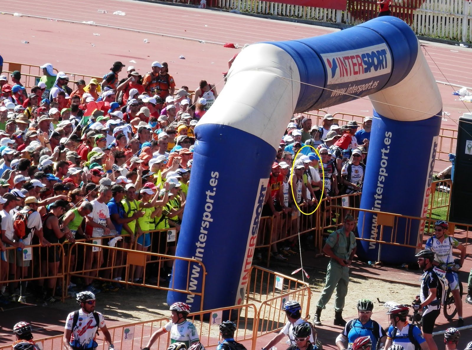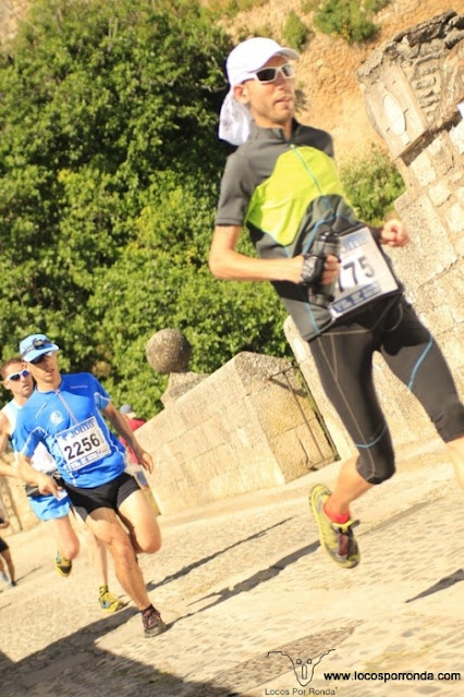 Los niveles, las marcas, los logros, las condiciones, lo que pude ser y no fui, lo que pretendo ser... todo, debería quedar para uno mismo, como forma de motivación, de enriquecimiento personal y de "fórmula" para ser feliz, pero nunca, jamás para creer y mucho menos para intentar siquiera hacer creer al resto que se es más, superior o mejor... si al final, con que uno lo sienta por dentro es suficiente y así es esta carrera. Como en todas ellas, hay ganadores pero no perdedores, detrás de cada participante hay una esperanza, un objetivo, un desafió. El mio, hacerlo lo mejor posible, así que el inicio de la carrera lo hice... lo mejor posible. Después de una salida agobiante (no exagero) por la aglomeración de gente, los gritos de la gentea, costumbrado a la libertad de correr en solitario. En ese momento intuí que la carrera seria una lucha en cualquiera de sus posiciones finales, pues la gente "peleaba" por colocarse en buen lugar. Los primeros kilómetros por las calles de Ronda fueron increíbles, la gente volcada animando, con ese calor entrando por tus venas, es difícil mantener la sangre fría, así que empecé a ponerme un ritmo muy duro, hasta tal punto que por el kilómetro 24, zona de las "Navetas" iba en la posición 12, los legionarios en los avituallamientos te animaban sin reservarse para el próximo, así aguanté hasta el kilómetro 29. Fueron los primeros 30 kilómetros mas emocionante de mi vida, las mtb se apartaban para que los pudiera adelantar, te animaban, había publico por todas partes, un cielo donde el sol brillaba con fuerza, me encontraba con "hambre". Pero es obvio que no duraría mucho, yo bien lo sabia, pero no me importaba porque estaba viviendo un sueño, mi sueño y ya habría tiempo de lamentarse. Poco a poco fui desinflándome... ya no corría en las subidas y tampoco me lanzaba en las bajadas... calambres... y con esfuerzo y voluntad pasé por Arriate y Alcalá del Valle hasta que llegué a Setenil de las Bodegas (kilómetro 59) en 5 horas y 30 minutos, los locales de estas localidades merecen mención aparte al igual que los legionarios, apoyo incondicional en todo momento. En Setenil me estaban esperando parte de mi familia que me acompañó en este viaje, el más ilusionado, mi "hermanillo", que me transmitió parte de su energía para poder continuar. Después de una pequeña parada para comer, continué trotando cuando podía y caminando cuando me obligaban... las piernas, pero en ese momento, en esos kilómetros, comprendí que hay mas carrera después de las primeras posiciones, la gente se esforzaba al máximo por avanzar, algunos cojeaban a ratos y corrían otro rato, yo no le encontraba sentido a esa voluntad, pues para mí ya solo quedaba "terminar" pero ellos querían algo más, rondariamos la posición 100 de la clasificación, pero ellos seguían dándolo todo por llegar un minuto o un puesto mejor, la competición no era contra nadie, sino contra ellos mismo, y así fijandome y admirando a mucho de los corredores que me adelantaron llegué al "acuartelamiento de la legión" (kilómetro 77) donde nunca pensé que me pararia a sentarme en el comedor con una bandeja y comida tranquilamente. Pero así lo hice, aunque al poco tiempo e impulsado por la fuerza que desprendían los corredores que llegaban a llenar el deposito de agua o a coger un "bocado" y continuar la marcha, me levanté de mi asiento y me puse a correr. Efectivamente, a correr, pues lo que quedaba hasta meta era poco más de un entrenamiento diario. Algo cambio en mí, físicamente la parada y la comida me hizo recuperarme un poco y la cercanía de la meta psicologicamente ayuda bastante. Creo que el recorrido a partir de este momento si se le podría clasificar como carrera por montaña, fue precioso, una subida a la Ermita de Montejaque muy bella, bajada a Benaojan con público, encender el frontal y subida por un sendero precioso hacia Ronda para volver a bajar a los pies del "Tajo de Ronda" iluminado en todo lo alto y terminar subiendo una cuesta de 3 kilómetros llamada el "cachondeo" hasta la meta... la meta, que decir de este momento, entrando en Ronda yo ya no podía correr, pero es imposible no hacerlo, el publico te empujaba con su aliento, nunca imagine que habría tanta gente y que animaran sin distinción, yo ni si reflejar la emoción del momento ni expresarla, en silencio pero feliz pase la meta.