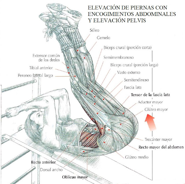 Este ejercicio trabaja en la primera fase, durante la elevación de las piernas, el psoas ilíaco, el tensor de la fascia lata y el recto anterior del cuádriceps. En la segunda fase, durante la elevación de la pelvis y la flexión de la columna, se solicita la banda abdominal, principalmente la parte de los rectos mayores del abdomen situada por debajo del ombligo. Para dar inicio al ejercicio debemos recostarnos sobre una colchoneta o superficie mirando hacia arriba, flexionaremos levemente las rodillas y elevaremos las piernas hasta que las mismas formen con el tronco un ángulo de 90 grados. Para ayudarnos con la posición debemos colocar los brazos extendidos a los lados del cuerpo y las manos debajo de glúteos.
