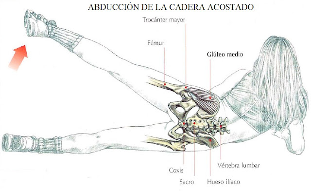 Este ejercicio lo suelo realizar con la ayuda de una banda elástica, colocada alrededor de los tobillos. El movimiento se efectúa elevando lateralmente una pierna, manteniendo la rodilla estirada. Luego se regresa a la posición inicial, sin perder la tensión de la banda elástica. Los ejercicios de abducción de cadera acostado, trabajan el glúteo medio y menor, así como los músculos principales de la curva de la cadera. Es preferible elaborar series largas, para lograr mejores resultados. Si se desea conseguir una mayor intensidad, se puede efectuar el movimiento con dos bandas elásticas alrededor de los tobillos.