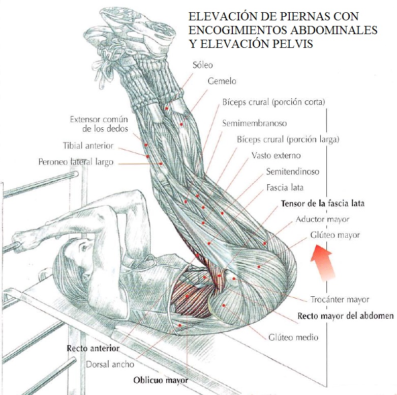 - Abdominales: Oblicuos internos y externos, transverso del abdomen y recto abdominal.
