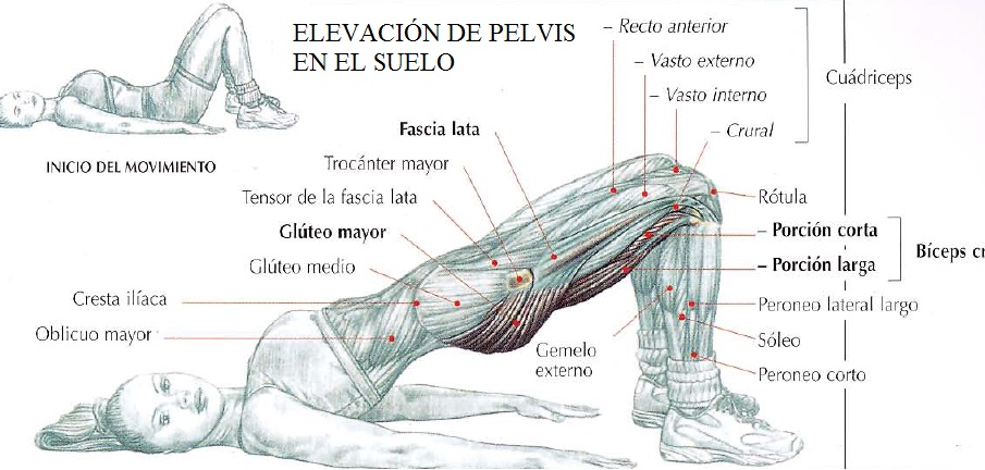 La elevación de pelvis en suelo, un ejercicio conocido como puente, es utilizado ampliamente para trabajar los glúteos, aunque también requiere del trabajo de los músculos de la pierna, sobre todo los isquiotibiales. Para trabajar más la parte posterior de las piernas (femorales) realizando puentes o elevaciones de pelvis en suelo, lo recomendable es elevar el punto de apoyo de los pies, para lo cual puedes utilizar un banco en el que colocar la planta de los pies y sin despegar la parte superior de la espalda del suelo, realizar elevaciones y descensos de la pelvis. Mantenerse arriba unos segundos antes de bajar.