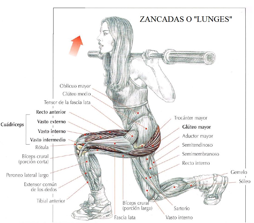 La zancada o lunge es uno de los ejercicios mas completos para el entrenamiento de las piernas, estimula tanto los glúteos, como el cuádriceps y las pantorrillas. Los principiantes pueden iniciar la ejecución de este ejercicio sin peso para luego agregar dificultad al ejecutarlo con mancuernas o con barra. La forma de realizarlo es de pie, con los pies ligeramente separados, miramos al frente, hundimos ligeramente la espalda y efectuamos una zancada hacia adelante manteniendo el tronco lo mas recto posible; durante la zancada, el muslo desplazado hacia adelante debe estabilizarse en la horizontal. regresar a la posición inicial. Los músculos involucrados son: Cuadriceps, glúteo mayor, isquiotibial, recto anterior, psoas, femoral.