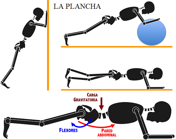 La plancha se ha convertido en un ejercicio de abdominales muy popular en los últimos años. A diferencia de las habituales flexiones de tronco, el trabajo de esta acción resulta muy interesante ya que sitúa a la pared abdominal en un contexto operativo similar a aquel que desempeña en el día a día: La plancha desafía el control lumbopélvico por parte de la pared abdominal. Por un lado tenemos la tensión de los flexores de la cadera que traccionan la cadera en anteversión; por otro lado, está la carga gravitatoria que pretende extender la región lumbar. Más aun, la postura exige a la musculatura abdominal un control del contenido visceral que “cuelga” hacia el suelo.