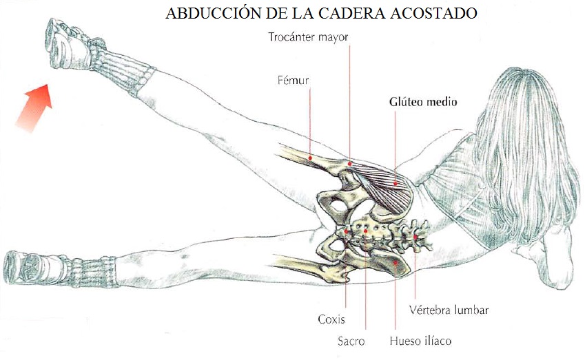Este ejercicio lo suelo realizar con la ayuda de una banda elástica, colocada alrededor de los tobillos. El movimiento se efectúa elevando lateralmente una pierna, manteniendo la rodilla estirada. Luego se regresa a la posición inicial, sin perder la tensión de la banda elástica. Los ejercicios de abducción de cadera acostado, trabajan el glúteo medio y menor, así como los músculos principales de la curva de la cadera. Es preferible elaborar series largas, para lograr mejores resultados. Si se desea conseguir una mayor intensidad, se puede efectuar el movimiento con dos bandas elásticas alrededor de los tobillos.