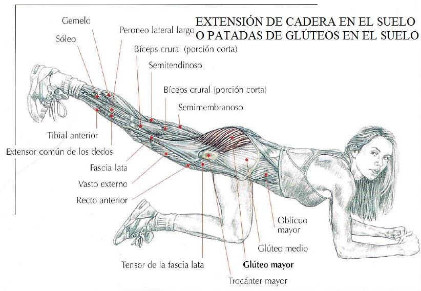 La extensión de cadera para glúteos es uno de los ejercicios más clásicos que existen, pero uno de los más infalibles al respecto. Para su ejecución nos colocaremos en el suelo a cuatro patas, apoyaremos los antebrazos al suelo, de modo que las manos queden libres y los codos apoyados por completo. La espalda debe mantenerse recta a lo largo de todo el ejercicio, y para ello nos apoyaremos con las piernas de rodillas. Partiendo de esta posición lo que debemos hacer es un movimiento muy sencillo, ya que simplemente debemos echar una de las piernas, la que no está apoyada en el suelo hacia atrás. La manera de hacerlo será concentrando todo el movimiento en la parte de las caderas y los glúteos, nunca en la espalda o la zona lumbar. Mantener unos segundos la pierna extendida antes de bajar y realizar nuevamente el movimiento.