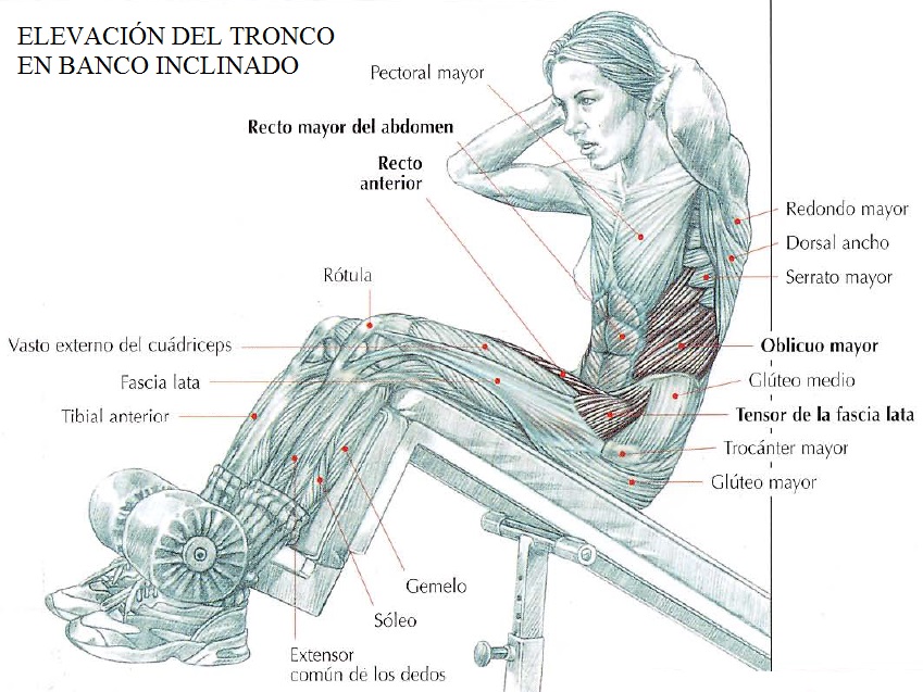 Para comenzar el ejercicio necesitamos de un banco ajustable o bien de una tabla inclinada. Con el banco inclinado nos sentamos sujetando las piernas en los cojines del extremo superior y desde allí, recostamos toda la espalda sobre el banco y colocamos las manos en cruz por delante del pecho. Así, comenzamos el movimiento. Inspiramos y cuando exhalamos elevamos el tronco del banco mediante la contracción del abdomen, nos detenemos allí unos segundos y regresamos inhalando hacia la posición inicial, sin recostarnos por completo en la tabla nuevamente, sino conservando una leve curvatura de la espalda. Este ejercicio solicita el trabajo de los abdominales, sobre todo, demanda el esfuerzo del conjunto de la banda abdominal: recto mayor del abdomen y recto anterior así como oblicuo mayor, también se requiere del trabajo del tensor de la fascia lata, el psoas ilíaco y el recto mayor del cuádriceps que permiten la anteversión de la pelvis que necesita el ejercicio para ejecutarse. Sino tuvieras un banco para realizar el ejercicio, existe la posibilidad de realizarlo en el suelo.