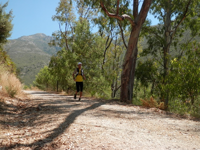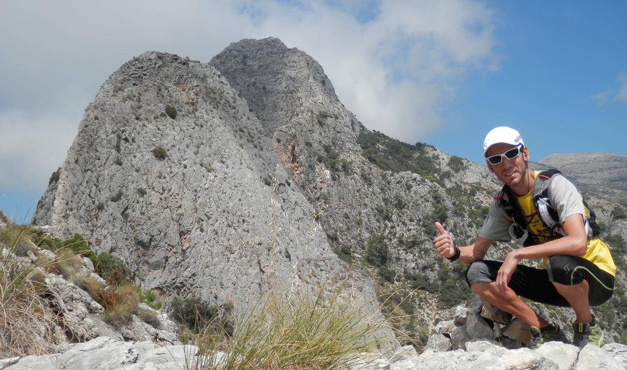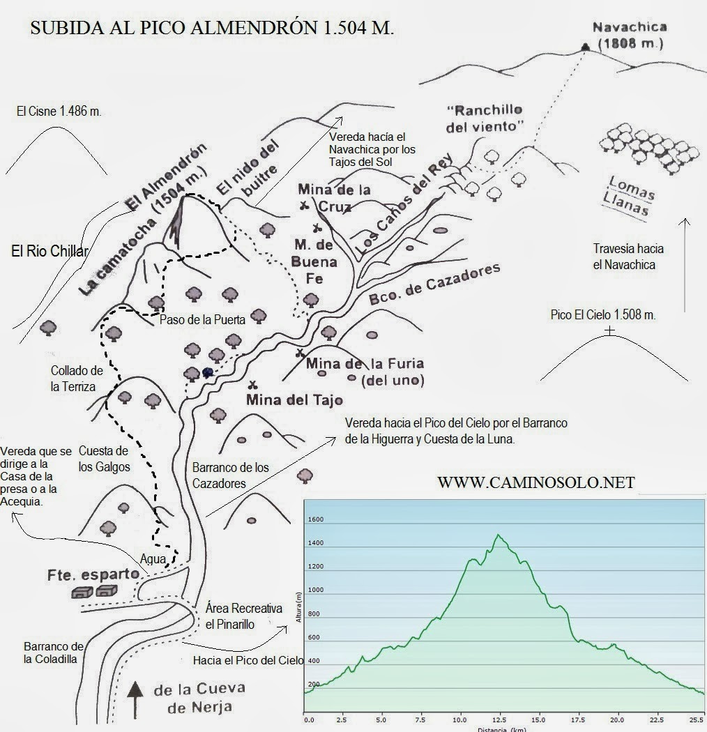 La ruta que he realizado la he comenzado en las Cuevas de Nerja por la pista forestal paralela al Barranco de las Coladillas hasta el área recreativa del Pinarillo, seguimos por el carril hasta que éste llega a coincidir con el arroyo y el comienzo del Barranco de los Cazadores por donde se puede subir al Navachica, El Cielo o El Almendrón. Yo continuo por la pista en dirección a la Fuente del Esparto, un desvio a la izquierda en fuerte subida nos lleva a la Cuesta de los Galgos, un sendero por donde empezamos a ganar altura paulatinamente a traves de una espesa maleza espinosa que a veces nos superaba en altura. El primer repecho al que llegamos es el Collado de la Terriza (1.120 m.) con espectaculares vistas sobre los Tajos de la Soledad que caen a plomo sobre el Barranco de los Cazadores, donde también se puede apreciar el sendero de subida por dicho barranco. Seguimos subiendo y llegamos a la Camatocha (1.311 m.), una pequeña explanada en las alturas, con unas impresionantes vistas a ambos lados de los barrancos, siendo las que dan al río Chillar las más espectaculares. Bordeamos el Almendroncillo por la derecha por un sensacional paso llamado La Puerta que también bordea la base del Almendrón y nos invita a coronar su cumbre por una fina arista. El tramo final de subida al Pico Almendrón, se pierde entre areniscas y pedreras, pero no tiene más secreto que continuar la arista que une Los tajos del Sol con nuestro destino. Las vistas de este pico son una de las más espectaculares de toda la Sierra, alzado en mitad de dos grandes barrancos como el de Los Cazadores y el del Río Chillar (800 metros) y con vistas al Cerro del Cisne, Navachica o Piedra Sillada, es un autentico placer su visita. La vuelta la he realizado por el mismo lugar, ya que considero que es más favorable para correr por aquí que por el Barranco de los Cazadores. Como viene siendo costumbre, cuando describo una ruta, es porque la he grabado en el gps, para ver datos como los 26 kilómetros que componen la ruta, como los 1.650 metros de D+, pero mejor verla en el canal de