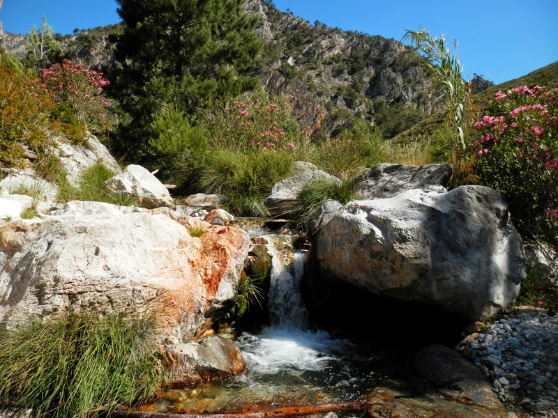 También nos encontramos a la derecha el cruce que sube a la senda del Cortijo del Imán, marcado por un hito de piedra, pero nosotros continuamos avanzando por las pozas frescas y naturales donde es inevitable la parada para jugar con ellas.