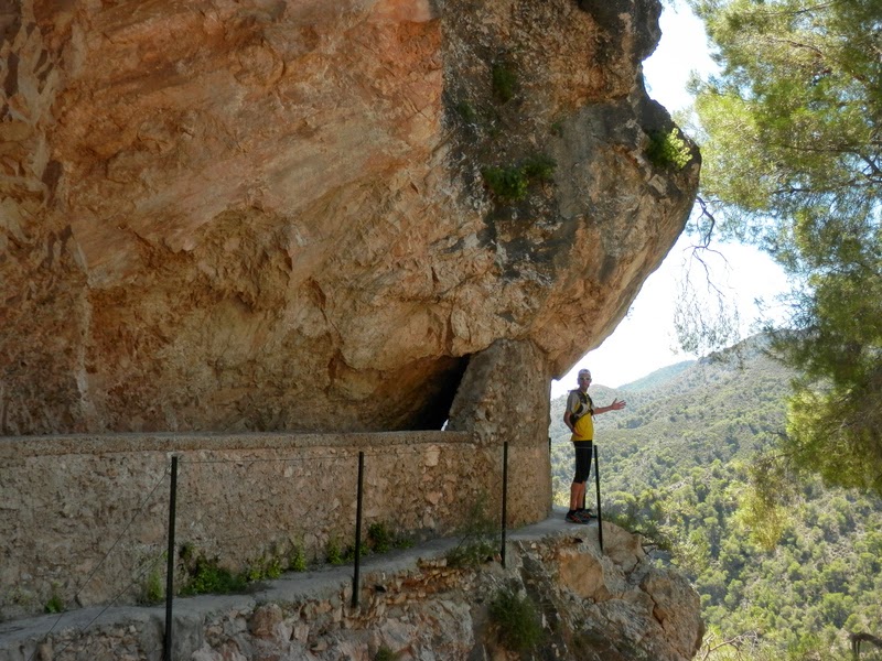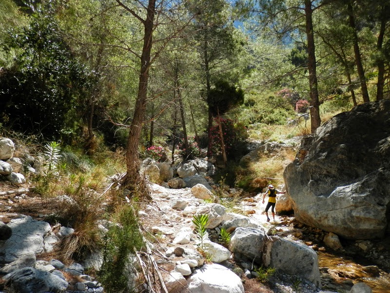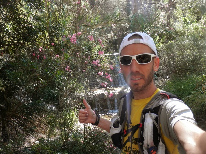 Ya no recordaba el trabajo que tiene hacer una entrada detallada de una ruta realizada, con fotos, track de la ruta, ubicación y nombre de lugares. Es una labor dura pero bonita al mismo tiempo, porque vas recordando detalles que no te fijaste en ese momento. Si me he decidido a realizar esta entrada no ha sido por ganas, si no porque en estos últimos meses de entrenamiento por esta parte de la Sierra, he coincidido con senderistas que me han preguntado como llegar a la Cascada de las Palomas o si tiene salida hacia las Cuevas de Nerja el Cerro Mangüeño. De esta forma se me ocurrió realizar una salida para fotografiar y grabar el track de todos esos puntos que me habían sugeridos en la misma ruta, como siempre, partiendo desde las Cuevas de Nerja. El track de la ruta, se puede ver en este enlace de wikiloc, tiene algunos cortes y cambios de desniveles un tanto extraño, creo que es debido a que perdía cobertura en algunos puntos de lo más profundo del cañón del Río Chillar, pero como orientación y seguimiento es perfecto. Al final salieron unos 35 kilómetros, 15 por agua, 5 por pista y 10 por terreno insinuoso. Desde las cuevas de Nerja se coge la pista forestal hasta la Fuente del Esparto para recargar las dos botellas de 200ml de agua, se sigue hasta el Collado del Apretadero, donde se ve la cuerda que cogeré a la vuelta.