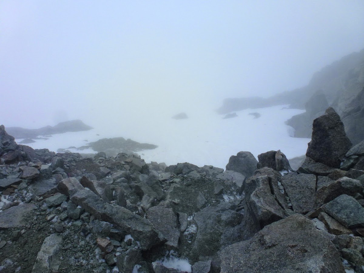 La mañana amaneció con mucha niebla y lloviznando, pensé ¿Así se puede subir al Aneto?. Ese es el mayor de los problemas de ir sólo, no tienes compañía, no tienes con quien compartir las dudas, a quien preguntarle o a quien responsabilizar de una decisión. Las dudas desaparecen en el justo momento que tomo rumbo a lo desconocido, buscando esa sonrisa en mi cara que nunca consigo ver pero que sé que existe en ese instante. Empiezo a ascender una ladera pedregosa con fuerte desnivel. Aparece en primer lugar el Ibón Baixo de Corones, sigo el camino que me marca algunos mojones de piedra y alcanzo la cubeta superior, donde están los ibones Altos de Corones o Ibons de Corones. El circo de Corones se alza en toda su magnitud, o eso imagino, porque mi vista alcanza pocos metros. Continuo por los restos del último pequeño helero de Corones, el único del macizo orientado al Sur. En ese momento tengo que calzarme los crampones, pues las marcas me llevan hasta una empinada pala de hielo que termina en rocas, vuelvo a imaginar que se trata del Collado de Coronas, y comienzo a trepar por ellas. Cuando consigo asomarme a la otra vertiente, el viento es terrible, el paso por el Glaciar del Aneto, aunque bastante vertical, no requiere de mucho esfuerzo, ya que la huella en la nieve está muy bien marcada por el paso de los que suben desde el Norte por la Renclusa.