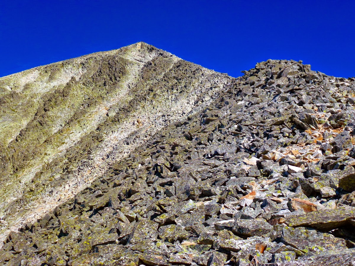 Desde este punto, la subida al Perdiguero la realicé directa, en línea recta, por una ladera rocosa a modo de pared que tras superarlo se llega al collado Ubago. Parece difícil, pero no lo es en absoluto, se trata de ir buscando las "terrazas" herbosas, a modo de pasillos improvisado creados por el paso de la gente. Tras esto llega una ancha arista y enorme pedrera que parece interminable.