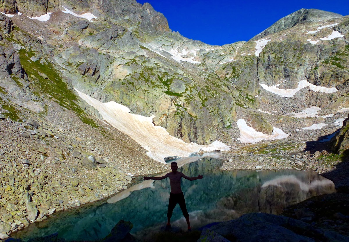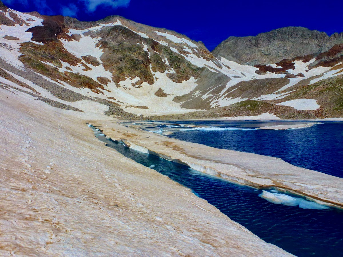 La siguiente imagen es del Ibon Blanco de Literola, al cual yo había llegado tras una increíble bajada deslizándome por toda la pala de nieve. Se puede observar que hay una pequeña huella en la nieve echa con las puntas de los crampones y una pendiente de unos 30 grados, hasta ahora lo más normal. Al no llevar crampones, patinaba sobre la nieve, cuando me fijé hasta donde podía llegar si me resbalaba, me asuste, al observar el escalón de medio metro para entrar y salir del ibón, el cual sólo se encontraba a pocos metros. Las emociones son difíciles de plasmar en una imagen, algo menos en palabras, pero la que yo percibí en ese momento fue peligro y creo que es la primera vez que uso esa palabra en este blog, tuve miedo de caer y no poder salir de él. Como de costumbre, me encontraba sólo...
