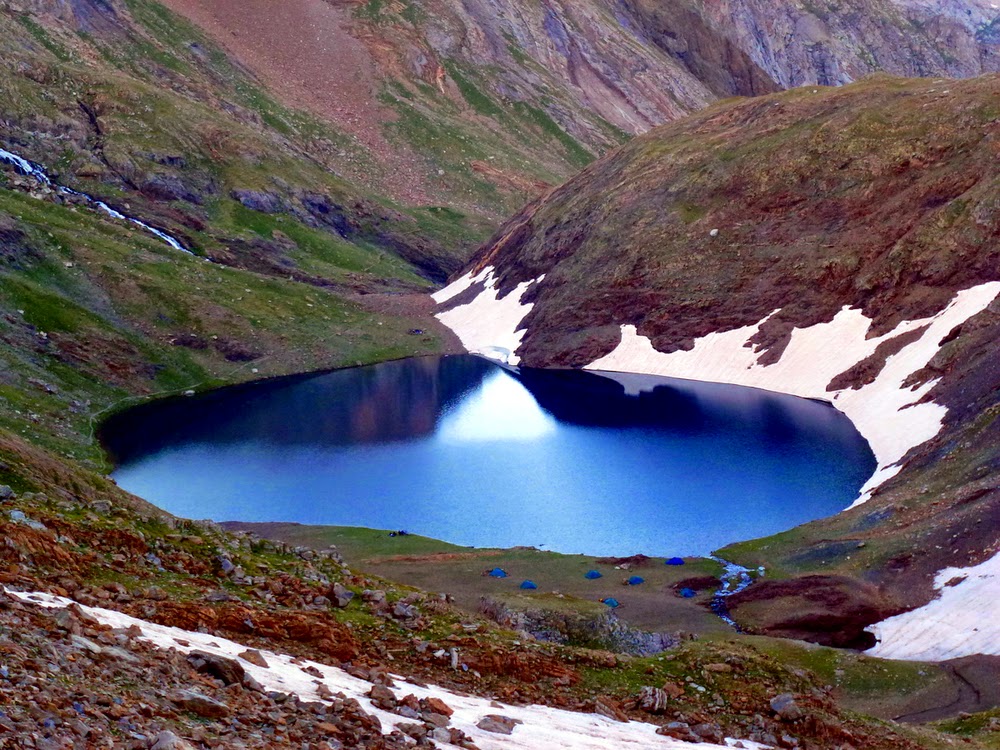 Al comenzar a bajar por la otra vertiente, me encuentro con uno de los ibones más espectaculares que he visto, el ibón de Llardaneta, que se emplaza a una altitud de 2.676 metros en un pequeño circo rodeado por cumbres que superan los 3.000 metros de altitud en un entorno de alta montaña. En él se encontraban un grupo de "scouts" acampados ocupando las mejores posiciones para plantar la tienda.