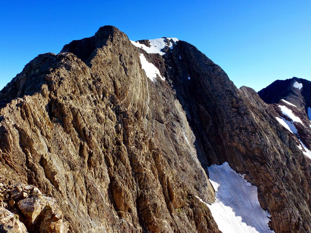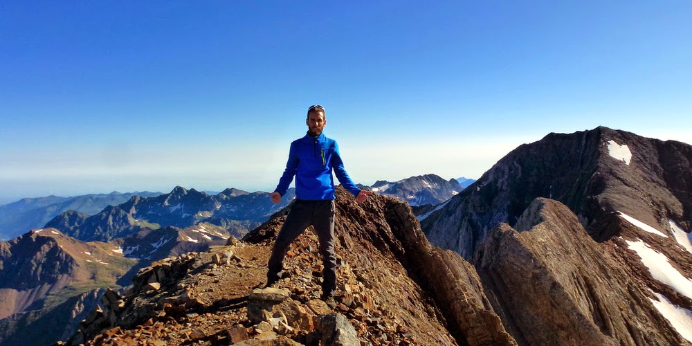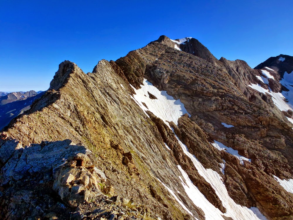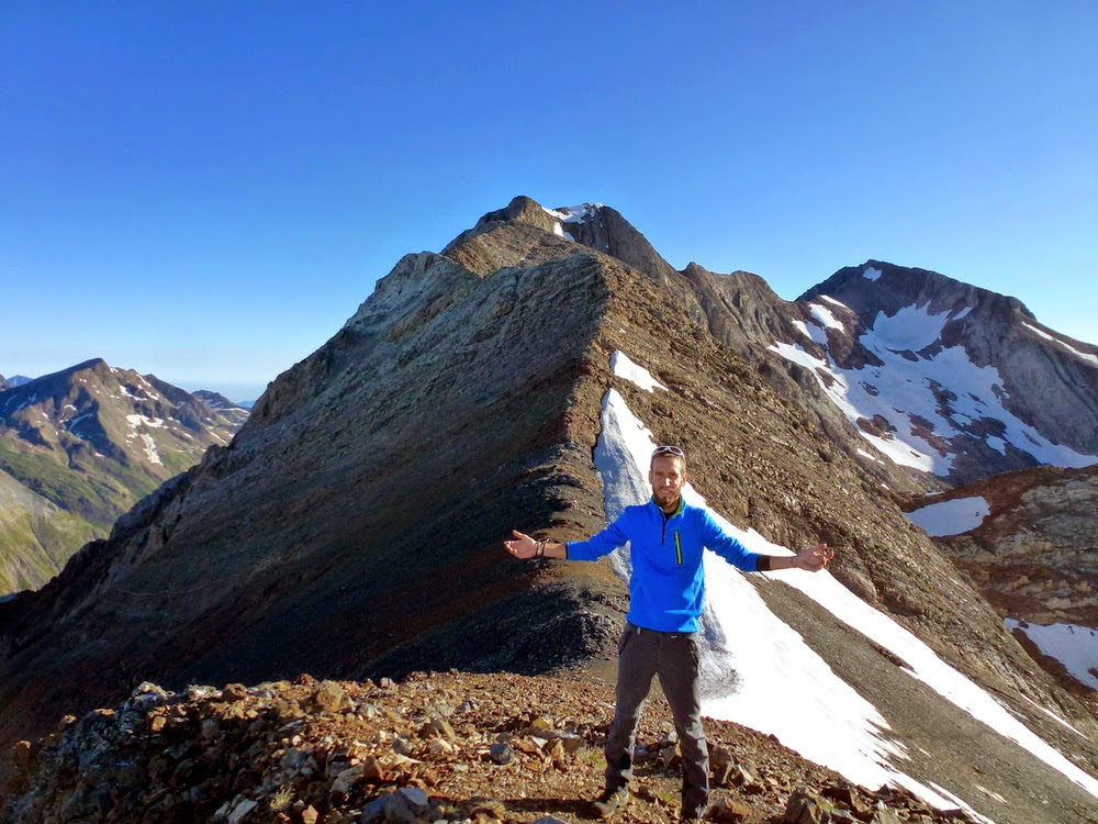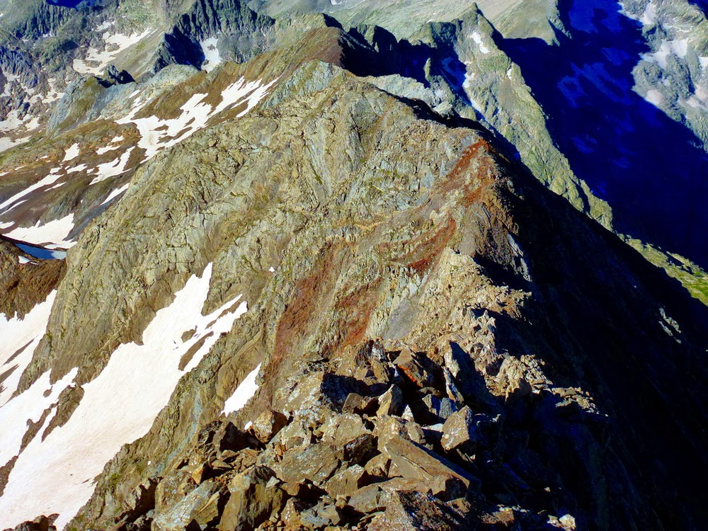 Y ya, después de estos pasos y cuchillas, la cresta culmina con la llegada a la antecima sur de Las Espadas (3.325 metros). Las Espadas se componen de 3 cimas o alturas reconocibles: antecima sur y norte con la misma altura, y en el centro la más alta a 3.332 metros. El día sigue siendo magnífico, me siento en una pequeña roca que cae al abismo, pero estoy tan excitado que no puedo quedarme quieto. Realizo varios fotos para inmortalizar la eternidad de estas montañas, de estos paisajes de ensueño, altos y fabulosos. Desde aquí veo lo que me queda de cresta, intuyo algún paso complicado, la puntiaguda cima de la Tuca de Llardaneta y el famoso paso del Funambulista.
