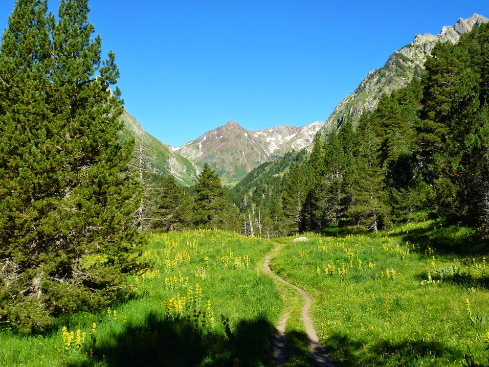 Continuo por el GR11 una senda muy bien marcada por la orilla izquierda del río hasta llegar al barranco Clarabide. Allí se cruza al margen derecho y se asciende con un desnivel pronunciado