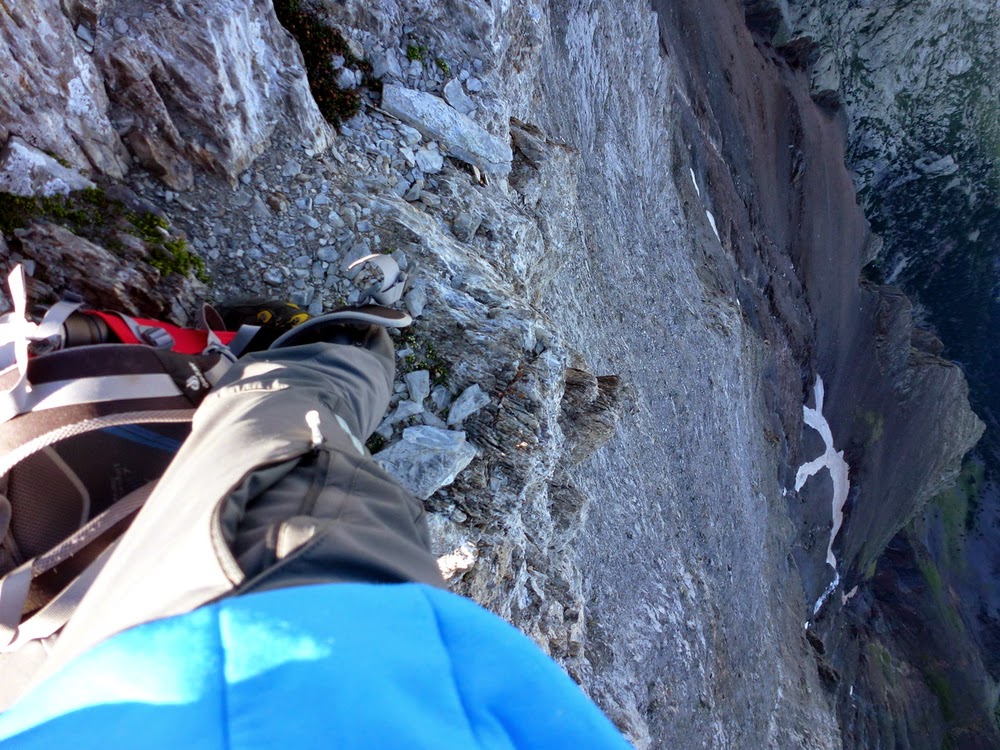 Recuerdo que al principio de una trepada, una de las más entretenida, observé a mi izquierda que abajo, al fondo tenía los restos del Glaciar de Llardana, el que me tragaría si llegara a caer. El paso forma una especie de pequeño diedro con grietas horizontales para meter bien los dedos hacía abajo y tirar de ellos ya que los píes no tienen buenos apoyos.